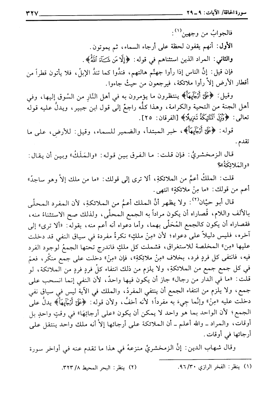 قال أبو حيَّان: ولا يظهر أنَّ الملك أعمُّ من الملائكةِ، لأن المفرد المحلَّى بالألف واللام، قُصاراه أن يكون مراداً به الجمع المحلَّى، ولذلك صح الاستثناءُ منه، فقصاراه أن يكون كالجمع المُحَلَّى بهما، وأما دعواه أنه أعم منه، بقوله: «ألا ترى» إلى آخره، فليس دليلاً على دعواه؛ لأن «مِنْ ملكٍ» نكرةٌ مفردة في سياق النفي قد دخلت عليها «مِن» المخلصة للاستغراق، فشملت كل ملكٍ فاندرج تحتها الجمعُ لوجود الفرد فيه، فانتفى كل فردٍ فرد، بخلاف «مِنْ ملائِكةِ» ، فإن «مِنْ» دخلت على جمع منكَّر، فعمّ في كل جمع جمع من الملائكةِ، ولا يلزم من ذلك انتفاء كلِّ فردٍ فردٍ من الملائكة، لو قلت: «ما في الدار من رجال» جاز أن يكون فيها واحدٌ، لأن النفي إنما انسحب على جمع، ولا يلزم من انتفاء الجمع أن ينتفي المفردُ، والملك في الآية ليس في سياق نفي دخلت عليه «مِنْ» وإنَّما جِيءَ به مفرداً؛ لأنه أخفُّ، ولأن قوله: {على أَرْجَآئِهَآ} يدلُّ على الجمع؛ لأن الواحد بما هو واحد لا يمكن أن يكون «على أرجائِهَا» في وقتٍ واحدٍ بل أوقات، والمراد - والله أعلم - أن الملائكة على أرجائها إلاَّ أنه ملك واحد ينتقل على أرجائها في أوقات.