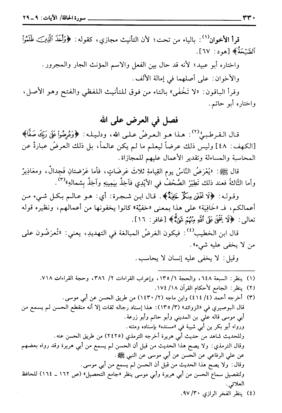 قال القرطبيُّ: هذا هو العرضُ على الله، ودليله: {وَعُرِضُواْ على رَبِّكَ صَفَّاً} [الكهف: 48] وليس ذلك عرضاً ليعلم ما لم يكن عالماً، بل ذلك العرضُ عبارةٌ عن المحاسبة والمساءلة وتقدير الأعمال عليهم للمجازاة.