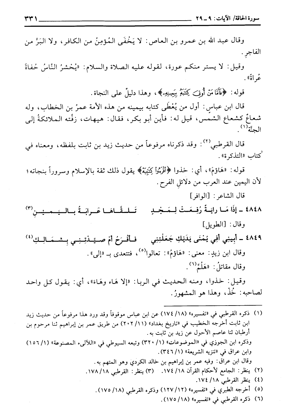 قوله: «هَاؤمَ» ، أي: خذوا {اقرؤا كِتَابيَهْ} يقول ذلك ثقة بالإسلام وسروراً بنجاته؛ لأن اليمين عند العرب من دلائلِ الفرح.