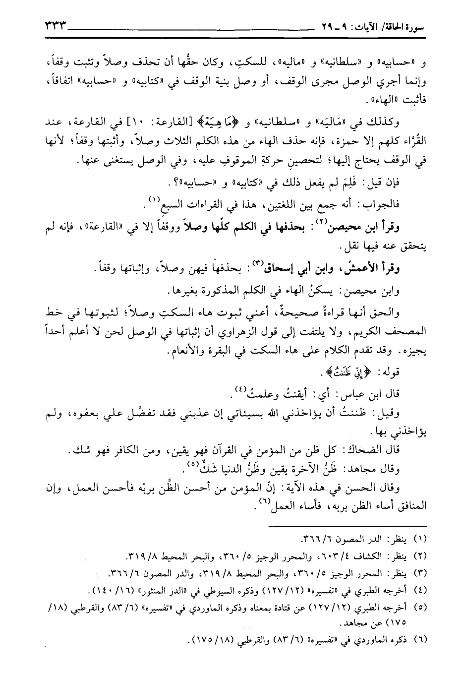 و «حسابيه» و «سلطانيه» و «ماليه» للسكتِ، وكان حقُّها أن تحذف وصلاً وتثبت وقفاً، وإنما أجري الوصل مجرى الوقف، أو وصل بنية الوقف في «كتابيه» و «حسابيه» اتفاقاً، فأثبت «الهاء» .