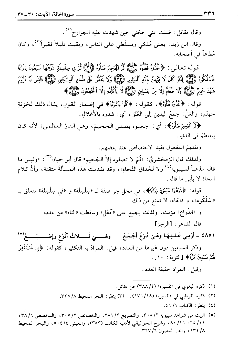 ولذلك قال الزمخشريُّ: «ثُمَّ لا تصلوه إلا الجَحيم» قال أبو حيان: «وليس ما قاله مذهباً لسيبويه ولا لحُذاقِ النُّحاةِ» ، وقد تقدمت هذه المسألةُ متقنة، وأنَّ كلام النحاة لا يأبى ما قاله.