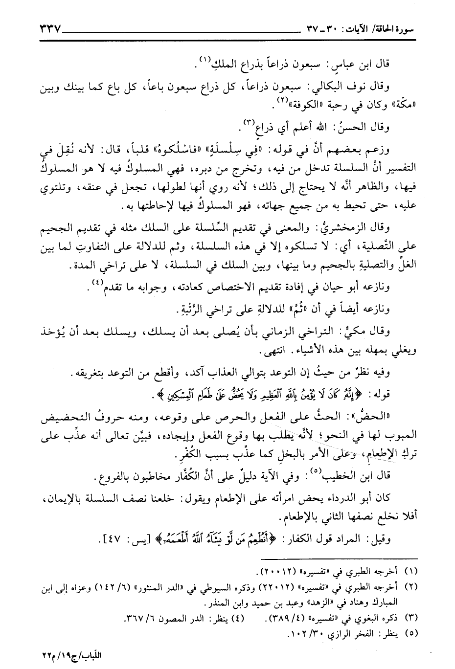 وقال الزمخشريُّ: والمعنى في تقديم السِّلسلة على السلك مثله في تقديم الجحيم على التًّصلية، أي: لا تسلكوه إلا في هذه السلسة، وثم للدلالة على التفاوتِ لما بين الغلِّ والتصليةِ بالجحيم وما بينها، وبين السلك في السلسلة، لا على تراخي المدة.