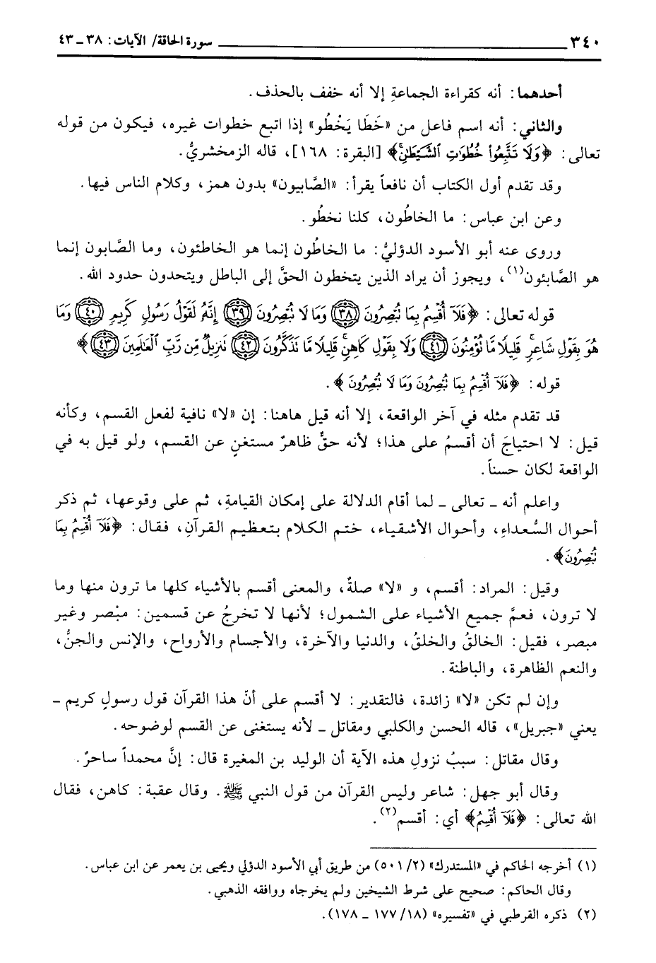 وقيل: المراد: أقسم، و «لا» صلةٌ، والمعنى أقسم بالأشياء كلها ما ترون منها وما لا ترون، فعمَّ جميع الأشياء على الشمول؛ لأنها لا تخرجُ عن قسمين: مبْصر وغير مبصر، فقيل: الخالقُ والخلقُ، والدنيا والآخرة، والأجسام والأرواح، والإنس والجنُّ، والنعم الظاهرة، والباطنة.