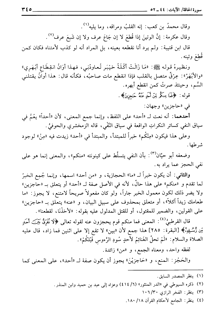 والثاني: أن يكون خبراً ل «ما» الحجازية، و «من أحد» اسمها، وإنما جُمِع الخبرُ لما تقدم و «منكم» على هذا حالٌ، لأنه في الأصل صفة ل «أحد» أو يتعلق ب «حاجزين» ولا يضر ذلك لكون معمول الخبر جاراً، ولو كان مفعولاً صريحاً لامتنع، لا يجوز: «ما طعامك زيداً آكلاً» ، أو متعلق بمحذوف على سبيل البيان، و «عنه» يتعلق ب «حاجزين» على القولين، والضمير للمقتول، أو للقتل المدلول عليه بقوله: «لأخذْنَا، لقطعنا» .