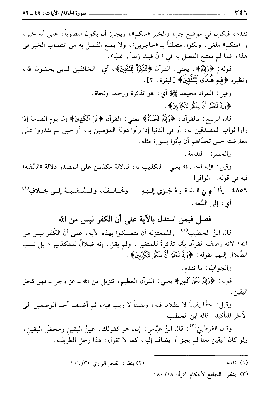 قال ابنُ الخطيب: وللمعتزلة أن يتمسكوا بهذه الآية، على أنَّ الكُفر ليس من الله؛ لأنه وصف القرآن بأنه تذكرةٌ للمتقين، ولم يقل: إنه ضلالٌ للمكذبين؛ بل نسب الضَّلال إليهم بقوله: {وَإِنَّا لَنَعْلَمُ أَنَّ مِنكُمْ مُّكَذِّبِينَ} .