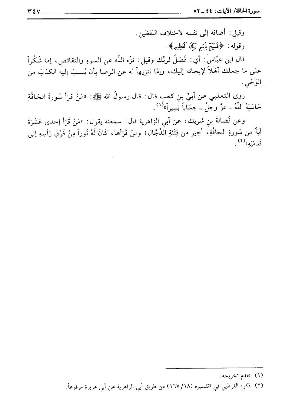 وعن فُضالةَ بنِ شريك، عن أبي الزاهرية قال: سمعته يقول: «مَنْ قَرَأ إحدى عَشْرَةَ آيةً من سُورةِ الحاقَّةِ، أجِير من فِتْنَةِ الدَّجَّالِ؛ ومنْ قَرَأها، كَانَ لَهُ نُوراً مِنْ فَوْقِ رَأسِهِ إلى قَدَمَيْهِ» .