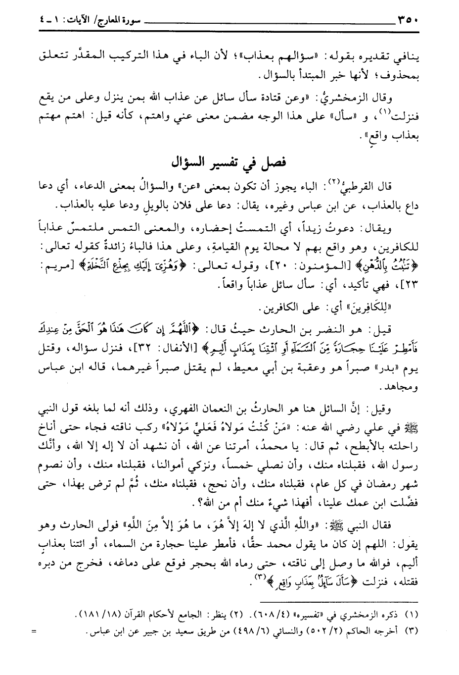 قال القرطبيُّ: الباء يجوز أن تكون بمعنى «عن» والسؤالُ بمعنى الدعاء، أي دعا داع بالعذاب، عن ابن عباس وغيره، يقال: دعا على فلان بالويلِ ودعا عليه بالعذاب.