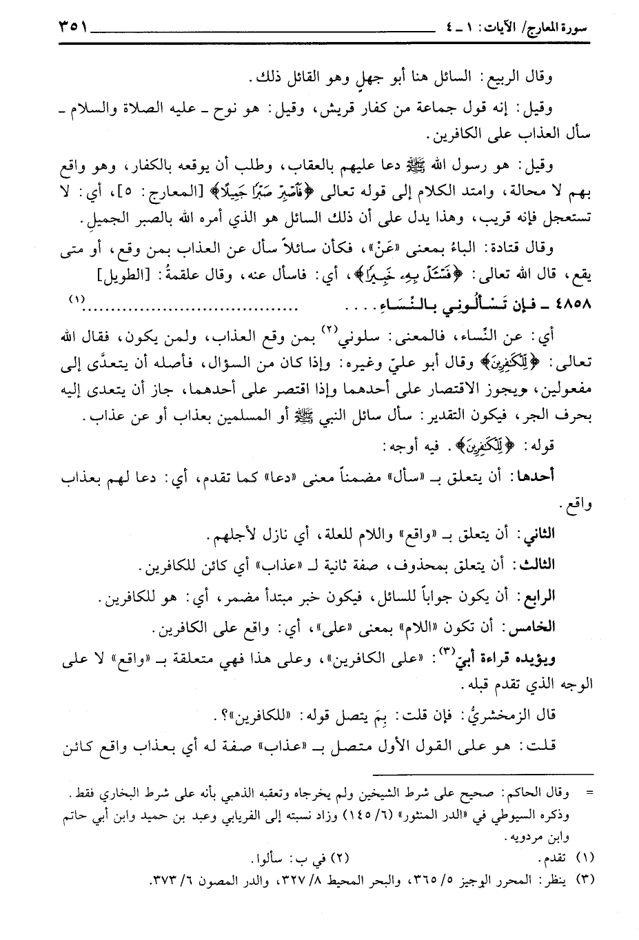 أي: عن النِّساء، فالمعنى: سلوني بمن وقع العذاب، ولمن يكون، فقال الله تعالى: {لِّلْكَافِرِينَ} وقال أبو عليّ وغيره: وإذا كان من السؤال، فأصله أن يتعدَّى إلى مفعولين، ويجوز الاقتصار على أحدهما وإذا اقتصر على أحدهما، جاز أن يتعدى إليه بحرف الجر، فيكون التقدير: سأل سائل النبي صَلَّى اللَّهُ عَلَيْهِ وَسَلَّم َ أو المسلمين بعذاب أو عن عذاب.