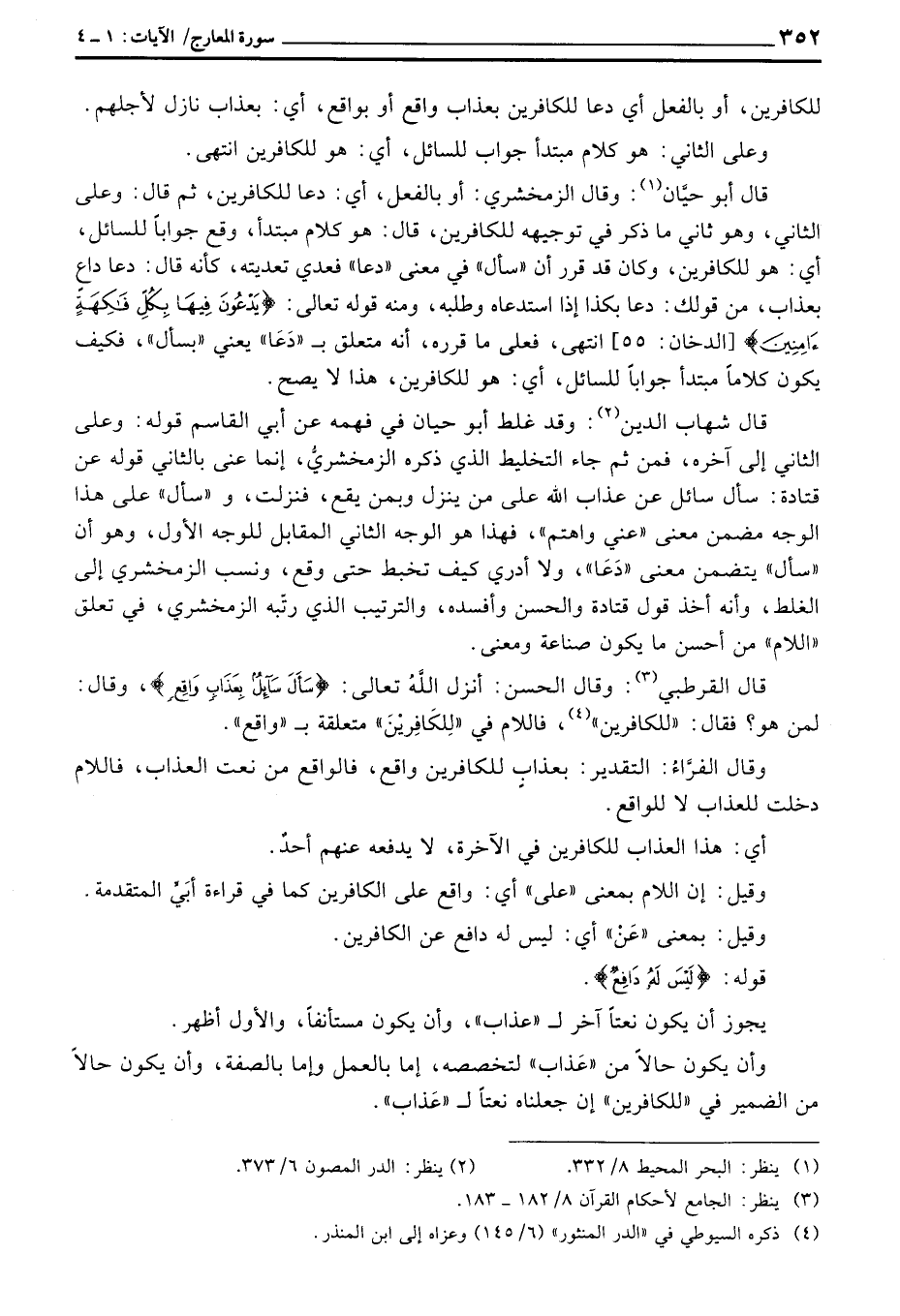 قال أبو حيَّان: وقال الزمخشري: أو بالفعل، أي: دعا للكافرين، ثم قال: وعلى الثاني، وهو ثاني ما ذكر في توجيهه للكافرين، قال: هو كلام مبتدأ، وقع جواباً للسائل، أي: هو للكافرين، وكان قد قرر أن «سأل» في معنى «دعا» فعدي تعديته، كأنه قال: دعا داعٍ بعذاب، من قولك: دعا بكذا إذا استدعاه وطلبه، ومنه قوله تعالى: {يَدْعُونَ فِيهَا بِكلِّ فَاكِهَةٍ آمِنِينَ} [الدخان: 55] انتهى، فعلى ما قرره، أنه متعلق ب «دَعَا» يعني «بسأل» ، فكيف يكون كلاماً مبتدأ جواباً للسائل، أي: هو للكافرين، هذا لا يصح.