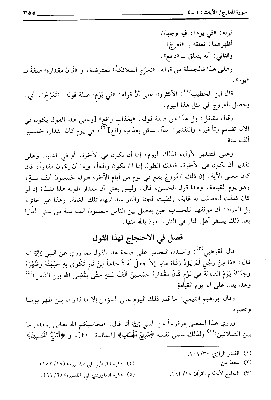 وعلى التقدير الأول، فذلك اليوم، إما أن يكون في الآخرة، أو في الدنيا. وعلى تقدير أن يكون في الآخرة، فذلك الطول إما أن يكون واقعاً، وإما أن يكون مقدراً، فإن كان معنى الآية: إن ذلك العُروجَ يقع في يوم من أيام الآخرة طوله خمسون ألف سنةٍ، وهو يوم القيامة، وهذا قول الحسن، قال: وليس يعني أن مقدار طوله هذا فقط؛ إذ لو كان كذلك لحصلت له غاية، ولنفيت الجنة والنار عند انتهاء تلك الغاية، وهذا غير جائز، بل المراد: أن موقفهم للحساب حين يفصل بين الناس خمسون ألف سنة من سني الدُّنيا بعد ذلك يستقر أهل النار في النار، نعوذ بالله منها.