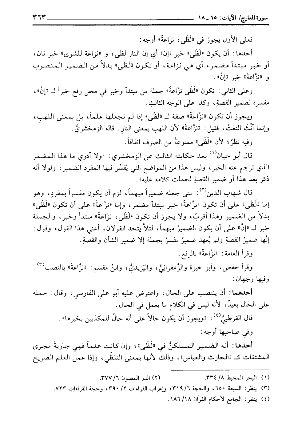 قال شهاب الدين: متى جعله ضميراً مبهماً، لزم أن يكون مفسراً بمفردٍ، وهو إما «لَظَى» على أن تكون «نزَّاعةً» خبر مبتدأ مضمر، وإما «نزَّاعةٌ» على أن تكون «لَظَى» بدلاً من الضمير وهذا أقربُ، ولا يجوز أن تكون «لَظَى، نزَّاعةٌ» مبتدأ وخبر، والجملة خبر ل «إنَّ» على أن يكون الضميرُ مبهماً، لئلاَّ يتحد القولان، أعني هذا القول، وقول: إنَّها ضميرُ القصةِ ولم يُعهد ضميرٌ مفسرٌ بجملة إلا ضمير الشأنِ والقصةِ.