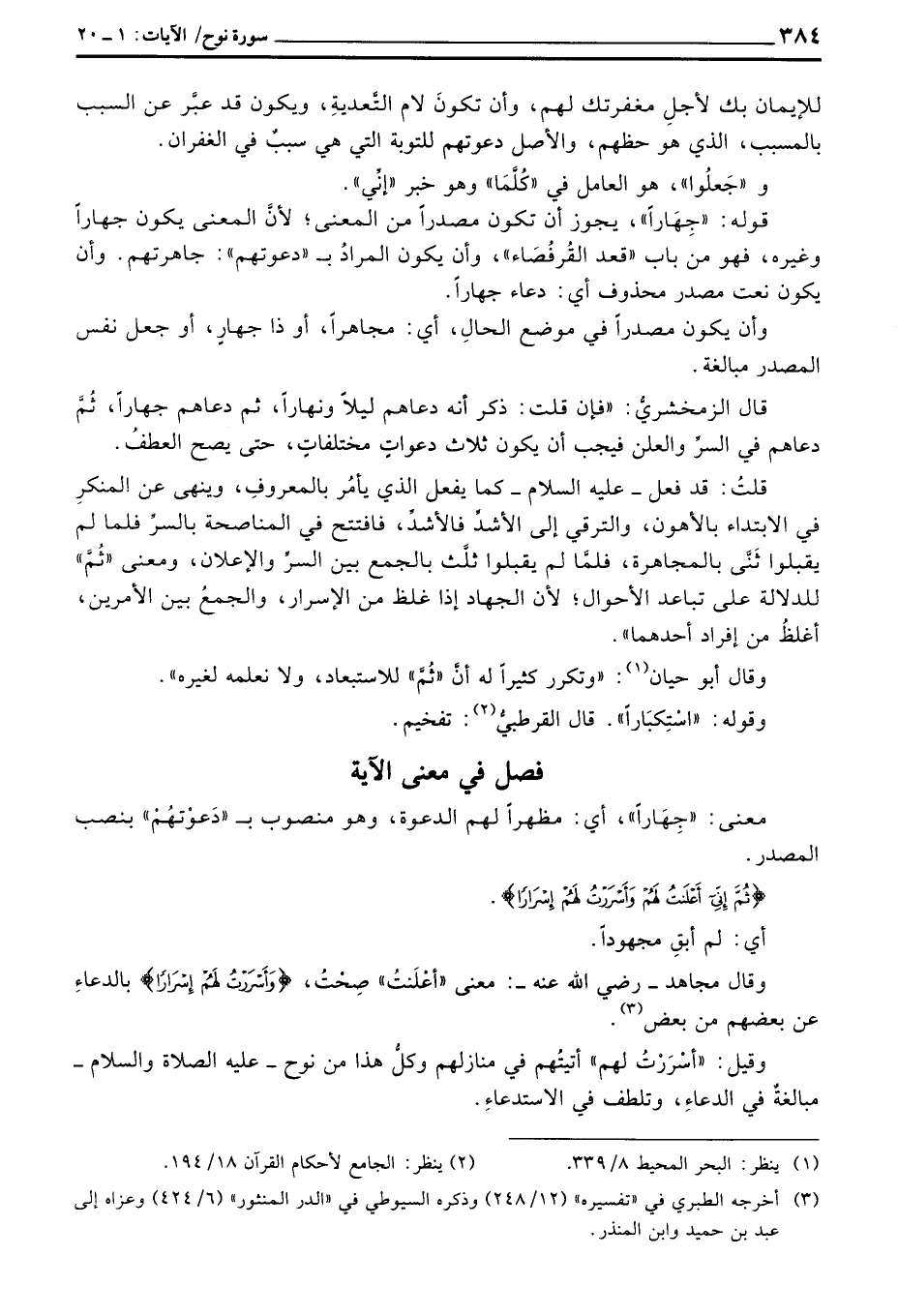 وقال مجاهد - رَضِيَ اللَّهُ عَنْه -: معنى «أعْلَنْتُ» صِحْتُ، {وَأَسْرَرْتُ لَهُمْ إِسْرَاراً} بالدعاءِ عن بعضهم من بعض.