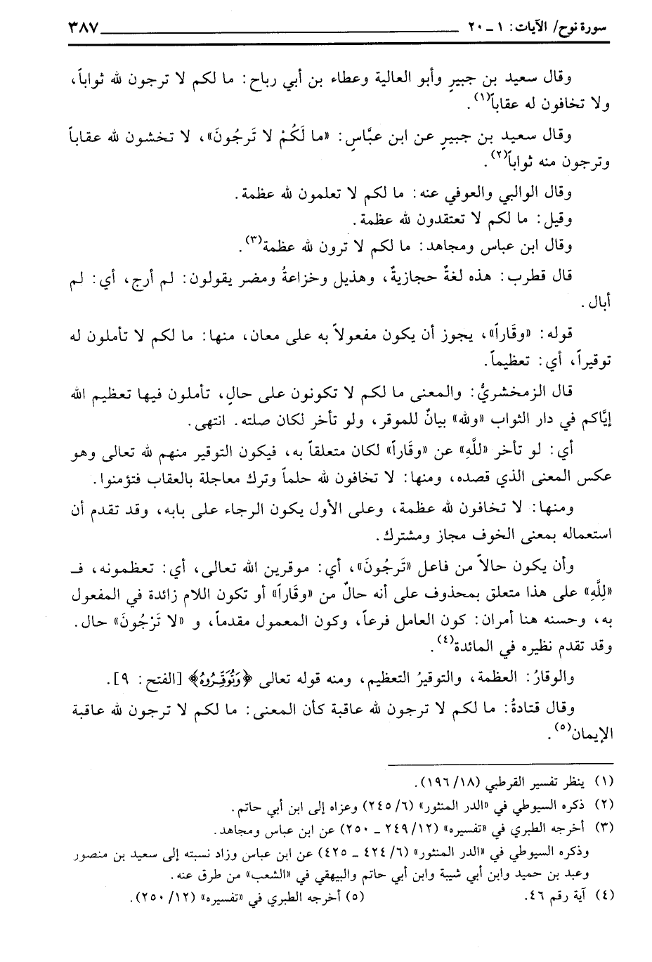 وقال سعيد بن جبيرٍ عن ابن عبَّاسٍ: {مَّا لَكُمْ لاَ تَرْجُونَ} ، لا تخشون لله عقاباً وترجون منه ثواباً.