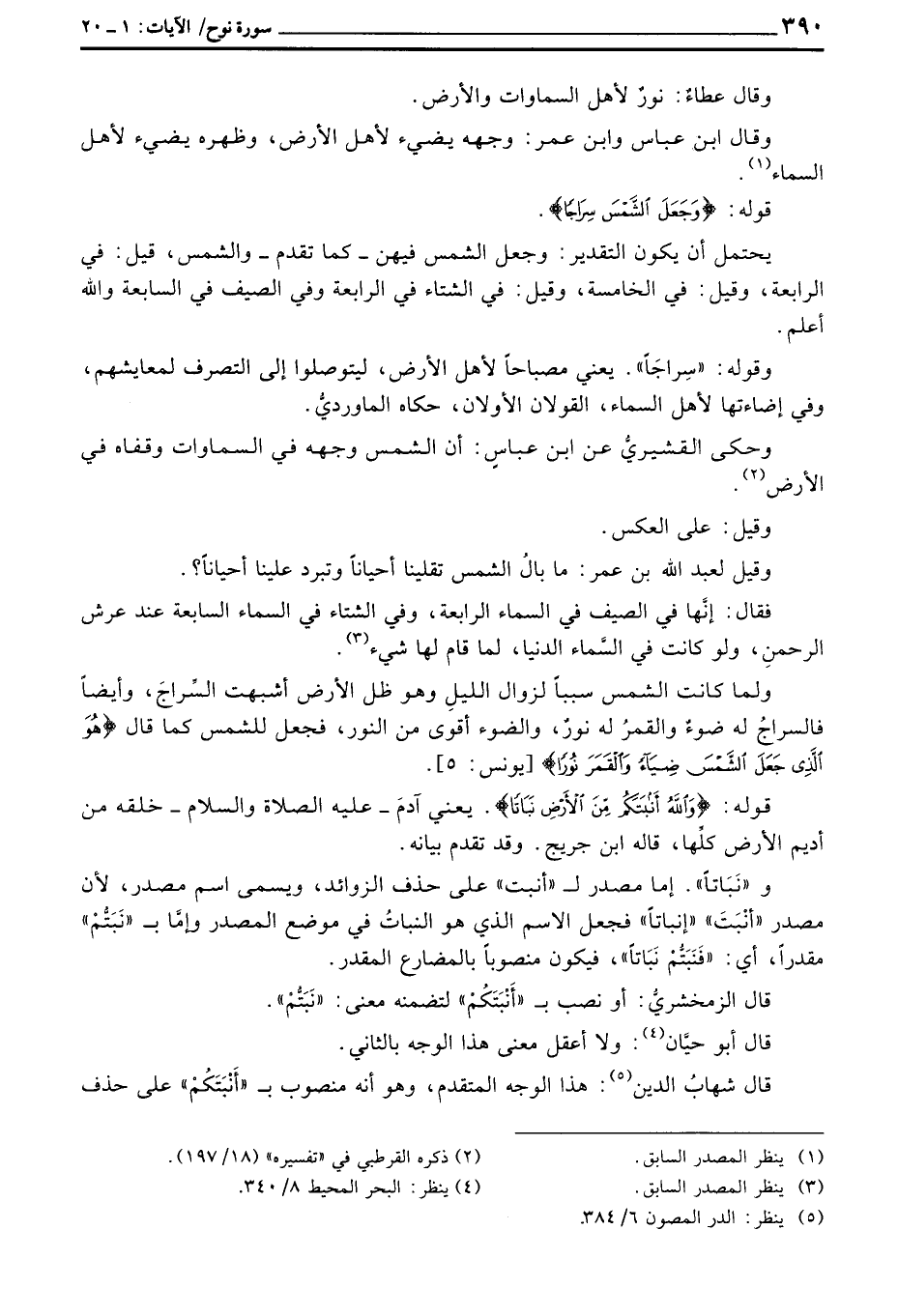 وقوله: «سِراجَاً» . يعني مصباحاً لأهل الأرض، ليتوصلوا إلى التصرف لمعايشهم، وفي إضاءتها لأهل السماء، القولان الأولان، حكاه الماورديُّ.