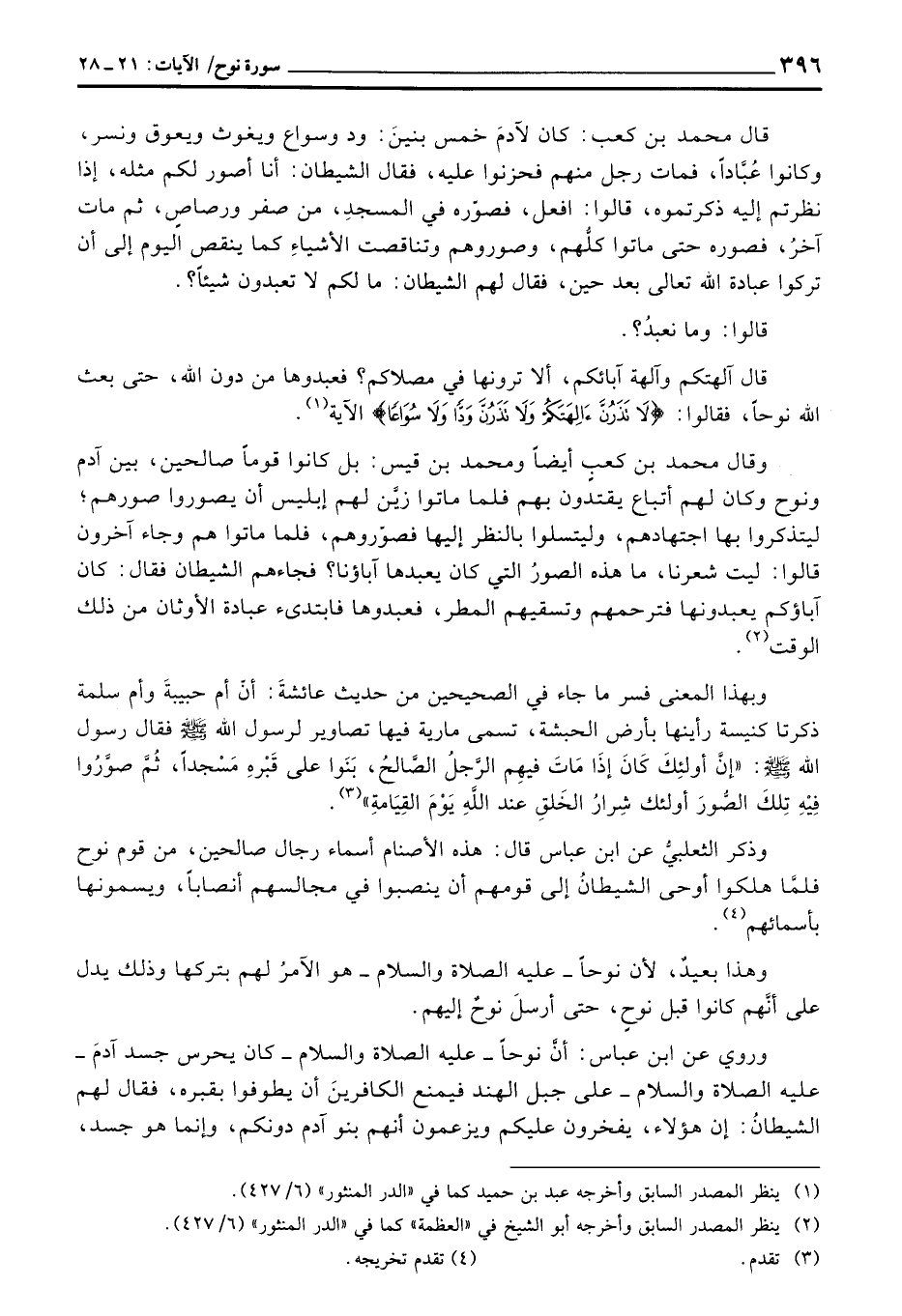 قال محمد بن كعب، كان لآدمَ خمس بنينَ: ود وسواع ويغوث ويعوق ونسر، وكانوا عُبَّاداً، فمات رجل منهم فحزنوا عليه، فقال الشيطان: أنا أصور لكم مثله، إذا نظرتم إليه ذكرتموه، قالوا: افعل، فصوّره في المسجدِ، من صفر ورصاصٍ، ثم مات آخرُ، فصوره حتى ماتوا كلُّهم، وصوروهم وتناقصت الأشياءِ كما ينقص اليوم إلى أن تركوا عبادة الله تعالى بعد حين، فقال لهم الشيطان: ما لكم لا تعبدون شيئاً؟ .