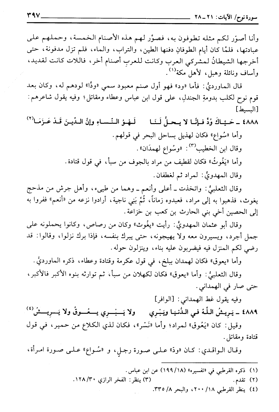 قال الماورديُّ: فما» ود «فهو أول صنم معبود سمي» ودّاً «لودهم له، وكان بعد قوم نوح لكلب بدومةِ الجندلِ، على قول ابن عباس وعطاء ومقاتل؛ وفيه يقول شاعرهم: [البسيط]