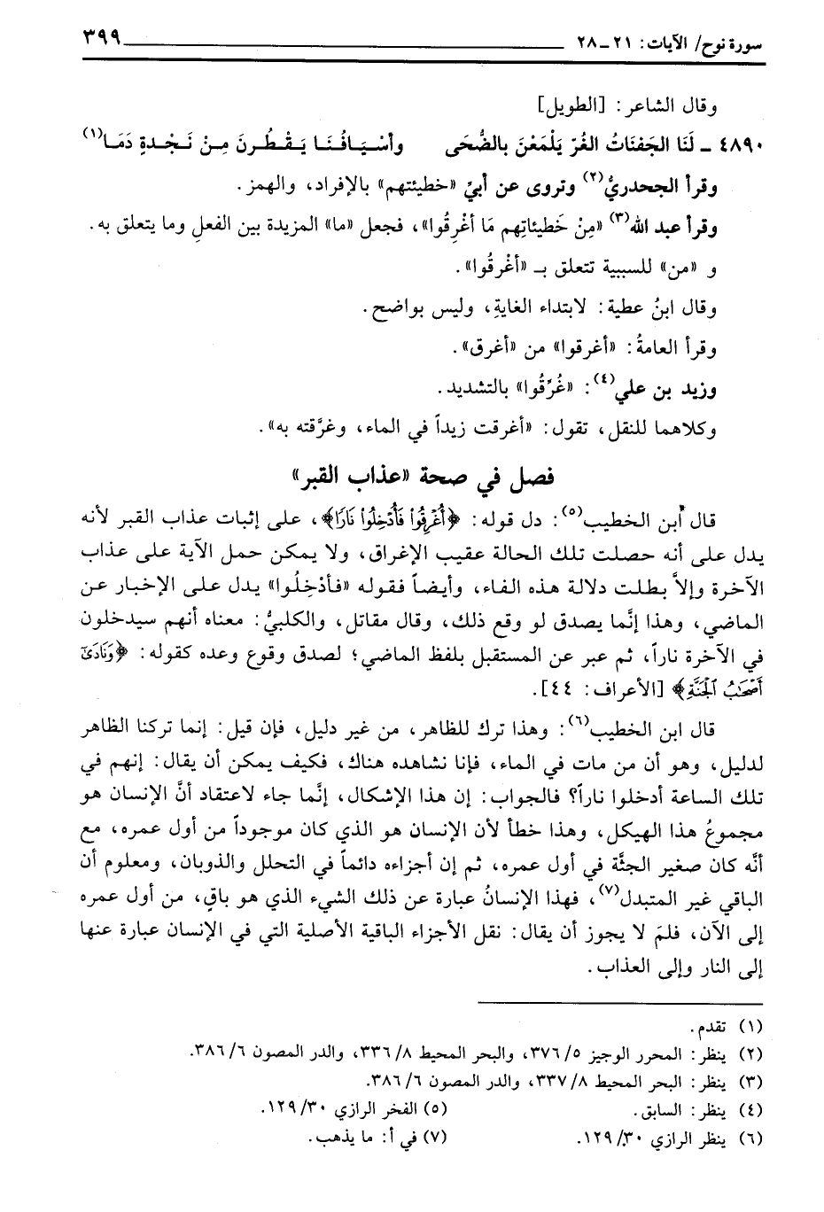 قال ابن الخطيب: وهذا ترك للظاهر، من غير دليل، فإن قيل: إنما تركنا الظاهر لدليل، وهو أن من مات في الماء، فإنا نشاهده هناك، فكيف يمكن أن يقال: إنهم في تلك الساعة أدخلوا ناراً؟ فالجواب: إن هذا الإشكال، إنَّما جاء لاعتقاد أنَّ الإنسان هو مجموعُ هذا الهيكل، وهذا خطأ لأن الإنسان هو الذي كان موجوداً من أول عمره، مع أنَّه كان صغير الجثَّة في أول عمره، ثم إن أجزاءه دائماً في التحلل والذوبان، ومعلوم أن الباقي غير المتبدل، فهذا الإنسانُ عبارة عن ذلك الشيء الذي هو باقٍ، من أول عمره إلى الآن، فلمَ لا يجوز أن يقال: نقل الأجزاء الباقية الأصلية التي في الإنسان عبارة عنها إلى النار وإلى العذاب.