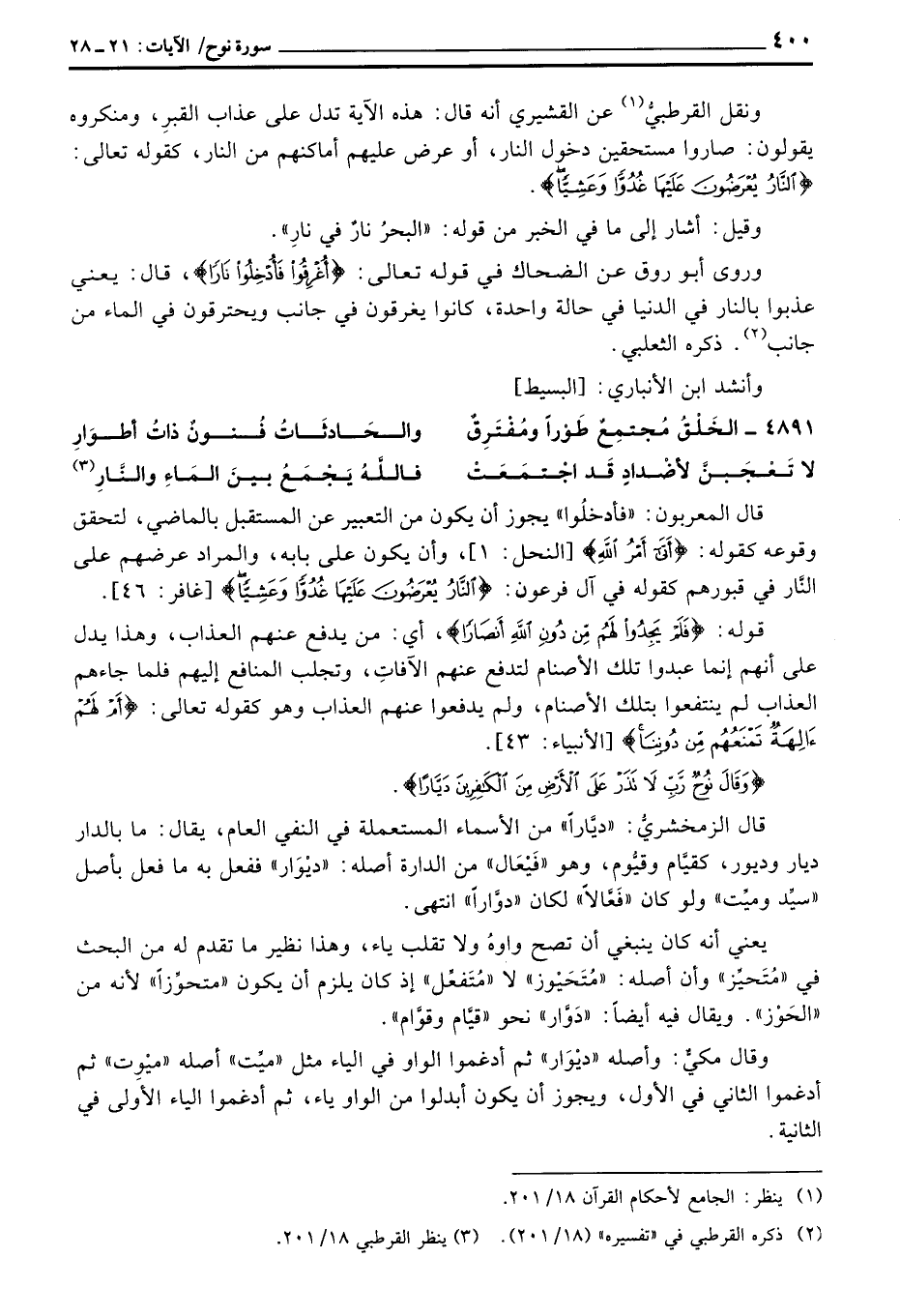 ونقل القرطبيُّ عن القشيري أنه قال: هذه الآية تدل على عذاب القبرِ، ومنكروه يقولون: صاروا مستحقين دخول النار، أو عرض عليهم أماكنهم من النار، كقوله تعالى: {النار يُعْرَضُونَ عَلَيْهَا غُدُوّاً وَعَشِيّاً} [غافر: 46] .