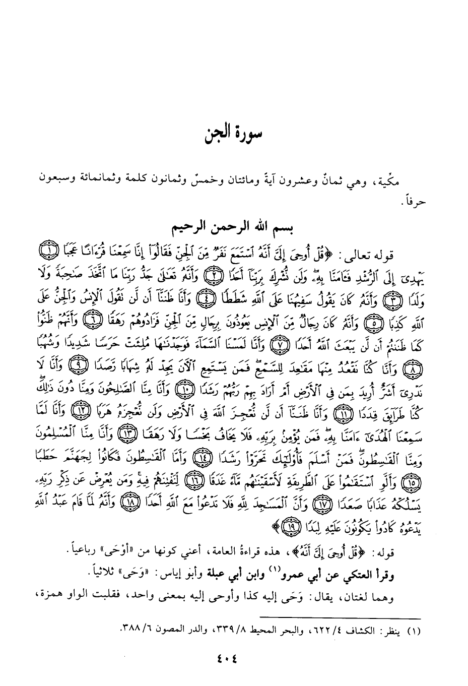 مكية، وهي ثمان وعشرون آية ومائتان وخمس وثمانون كلمة وثمانمائة وسبعون حرفا. بسم الله الرحمن الرحيم قوله: {قُلْ أُوحِيَ إِلَيَّ أَنَّهُ} ، هذه قراءةُ العامة، أعني كونها من «أوْحَى» رباعياً.