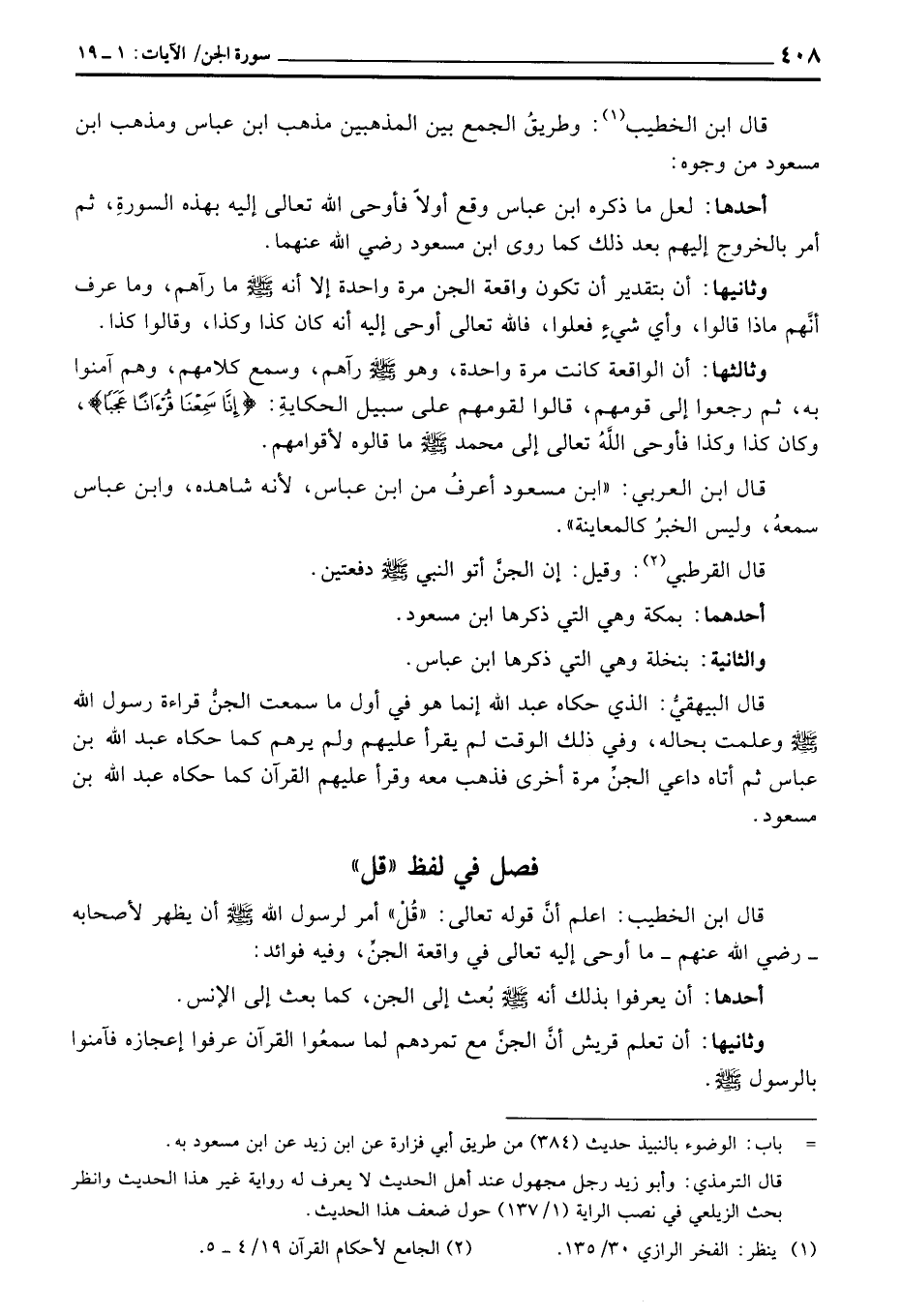 قال البيهقيُّ: الذي حكاه عبد الله إنما هو في أول ما سمعت الجنُّ قراءة رسول الله صَلَّى اللَّهُ عَلَيْهِ وَسَلَّم َ وعلمت بحاله، وفي ذلك الوقت لم يقرأ عليهم ولم يرهم كما حكاه عبد الله بن عباس ثم أتاه داعي الجنِّ مرة أخرى فذهب معه وقرأ عليهم القرآن كما حكاه عبد الله بن مسعود.