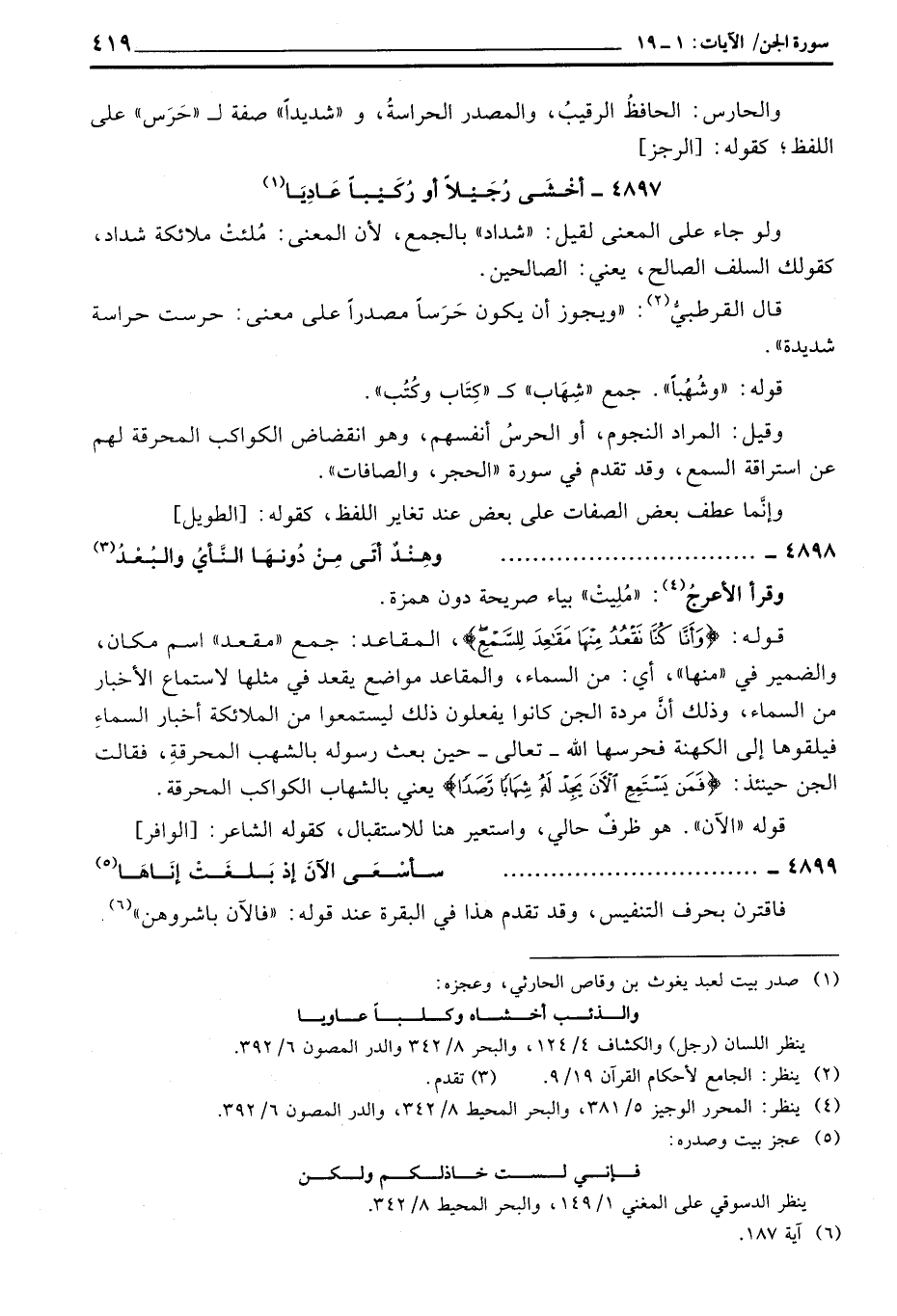 4897 - أخْشَى رُجَيْلاً أو رُكَيْباً عَادِيَا ... ولو جاء على المعنى لقيل: «شداد» بالجمع، لأن المعنى: مُلئتْ ملائكة شداد، كقولك السلف الصالح، يعني: الصالحين.