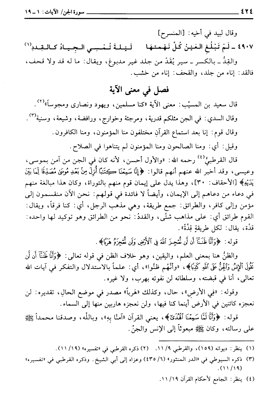 قال القرطبيُّ رَحِمَهُ اللَّهُ: «والأول أحسن، لأنه كان في الجن من آمن بموسى، وعيسى، وقد أخبر الله عنهم أنهم قالوا: {إِنَّا سَمِعْنَا كِتَاباً أُنزِلَ مِن بَعْدِ موسى مُصَدِّقاً لِّمَا بَيْنَ يَدَيْهِ} [الأحقاف: 30] ، وهذا يدل على إيمان قوم منهم في دعاء من دعاهم إلى الإيمان، وأيضاً لا فائدة في قولهم: نحن الآن منقسمون إلى مؤمن وإلى كافر، والطرائق: جمع طريقة، وهي مذهب الرجل، أي: كنا فرقاً، ويقال: القوم طرائق أي: على مذاهب شتَّى، والقددُ: نحو من الطرائق وهو توكيد لها واحده: قدَّة، يقال: لكل طريقةٍ قِدَّةٌ» .