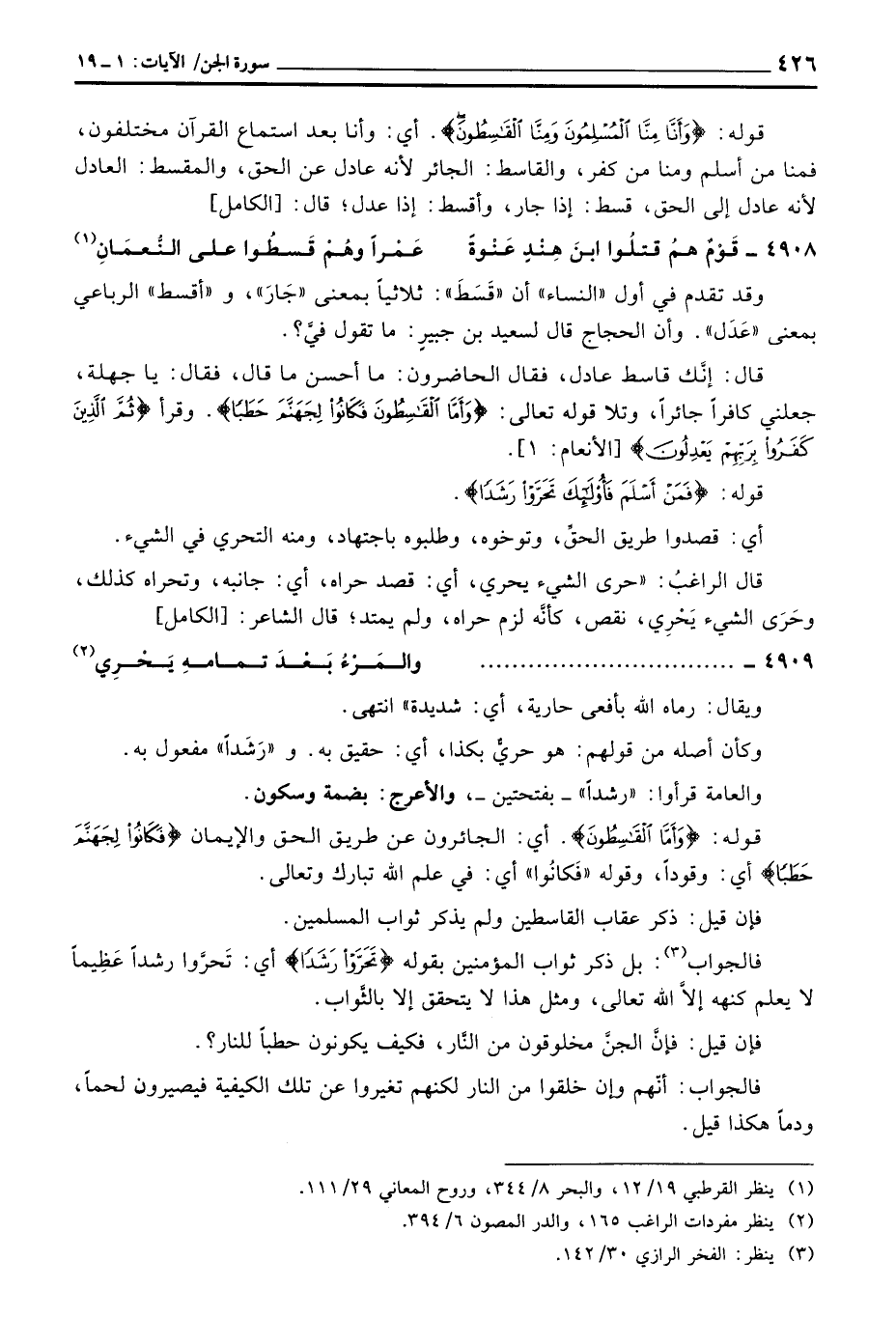 قال: إنَّك قاسط عادل، فقال الحاضرون: ما أحسن ما قال، فقال: يا جهلة، جعلني كافراً جائراً، وتلا قوله تعالى: {وَأَمَّا القاسطون فَكَانُواْ لِجَهَنَّمَ حَطَباً} . وقرأ {ثْمَّ الذين كَفَرُواْ بِرَبِّهِمْ يَعْدِلُونَ} [الأنعام: 1] .