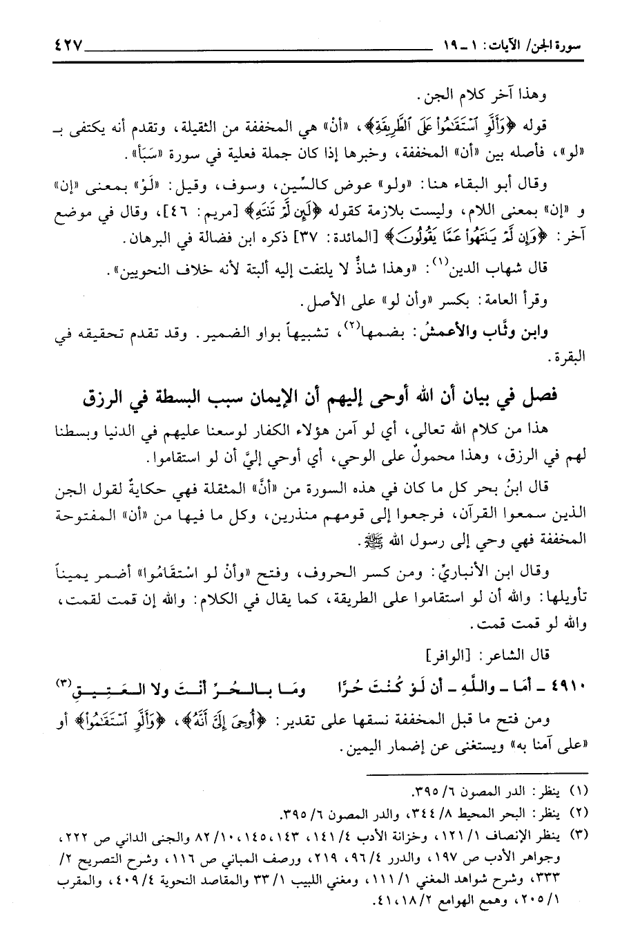 قوله {وَأَلَّوِ استقاموا عَلَى الطريقة} ، «أنْ» هي المخففة من الثقيلة، وتقدم أنه يكتفي ب «لو» ، فأصله بين «أن» المخففة، وخبرها إذا كان جملة فعلية في سورة «سَبَأ» .