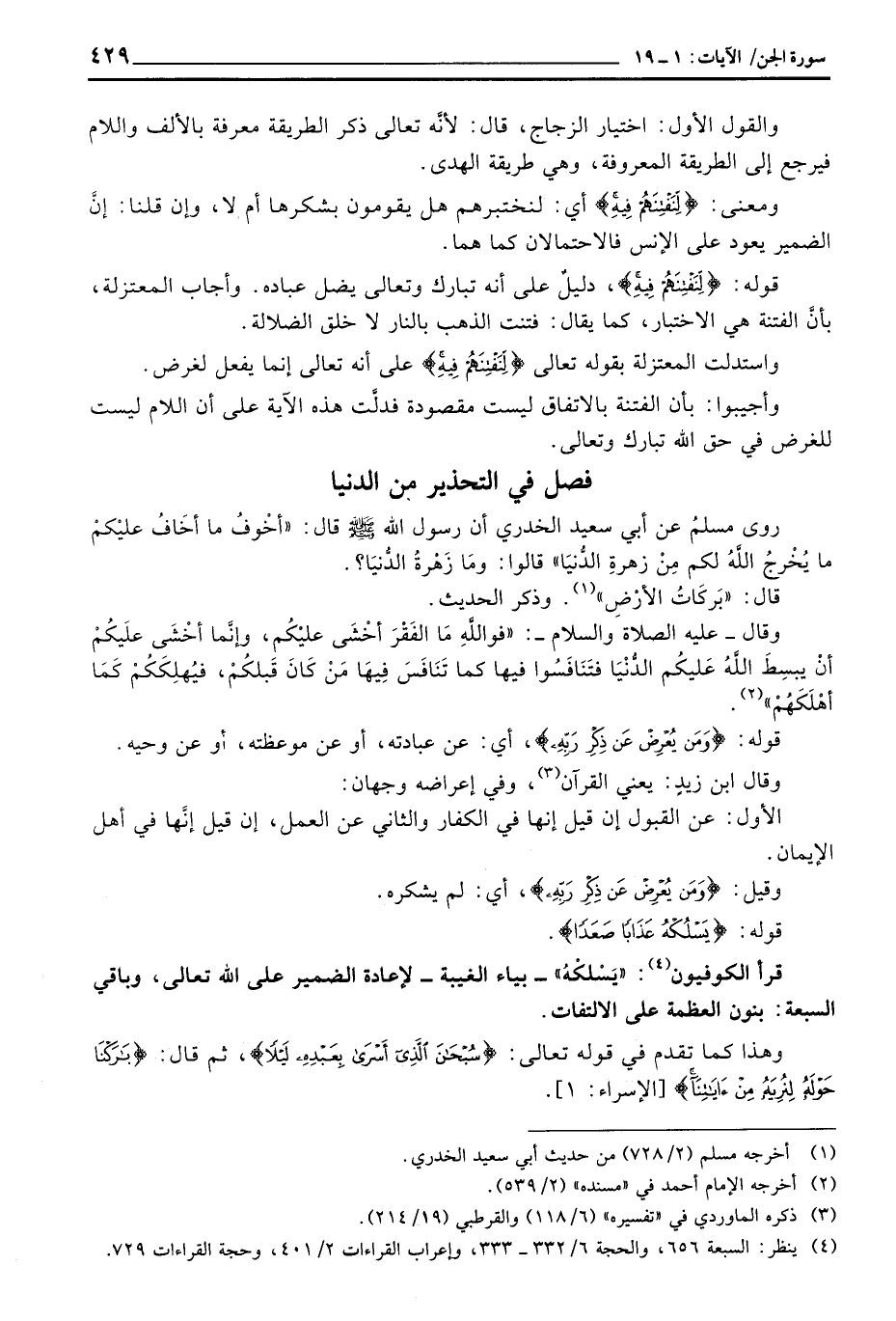 قوله: {لِّنَفْتِنَهُمْ فِيهِ} ، دليلٌ على أنه تبارك وتعالى يضل عباده. وأجاب المعتزلة، بأنَّ الفتنة هي الاختبار، كما يقال: فتنت الذهب بالنار لا خلق الضلالة.