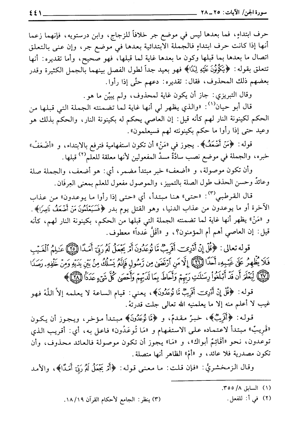قال القرطبي: «حتى» هنا مبتدأ، أي «حتى أذا رأوا ما يوعدون» من عذاب الآخرة أو ما يوعدون من عذاب الدنيا، وهو القتل يوم بدر {فَسَيَعْلَمُونَ مَنْ أَضْعَفُ نَاصِراً} . و «مَنْ» يظهر أنها غاية لما تضمنته الجملة التي قبلها من الحكم، بكينونة النار لهم، كأنه قيل: إن العاصي أهم أم المؤمنون؟ و «أقَلُّ عَداداً» معطوف.