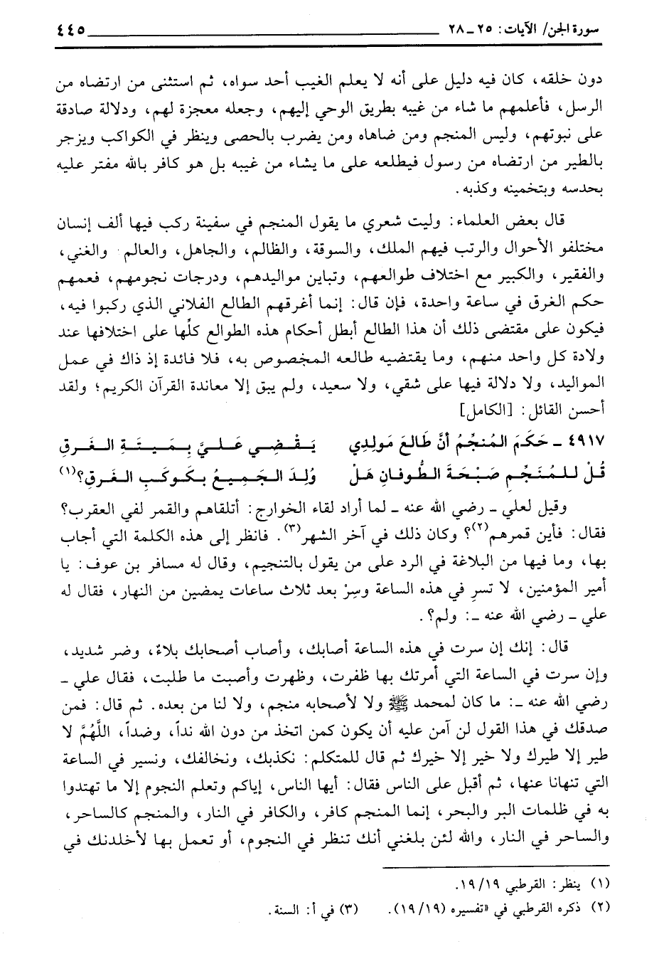 قال بعض العلماء: وليت شعري ما يقول المنجم في سفينة ركب فيها ألف إنسان مختلفو الأحوال والرتب فيهم الملك، والسوقة، والظالم، والجاهل، والعالم والغني، والفقير، والكبير مع اختلاف طوالعهم، وتباين مواليدهم، ودرجات نجومهم، فعمهم حكم الغرق في ساعة واحدة، فإن قال: إنما أغرقهم الطالع الفلاني الذي ركبوا فيه، فيكون على مقتضى ذلك أن هذا الطالع أبطل أحكام هذه الطوالع كلِّها على اختلافها عند ولادة كل واحد منهم، وما يقتضيه طالعه المخصوص به، فلا فائدة إذ ذاك في عمل المواليد، ولا دلالة فيها على شقي، ولا سعيد، ولم يبق إلا معاندة القرآن الكريم؛ ولقد أحسن القائل: [الكامل]