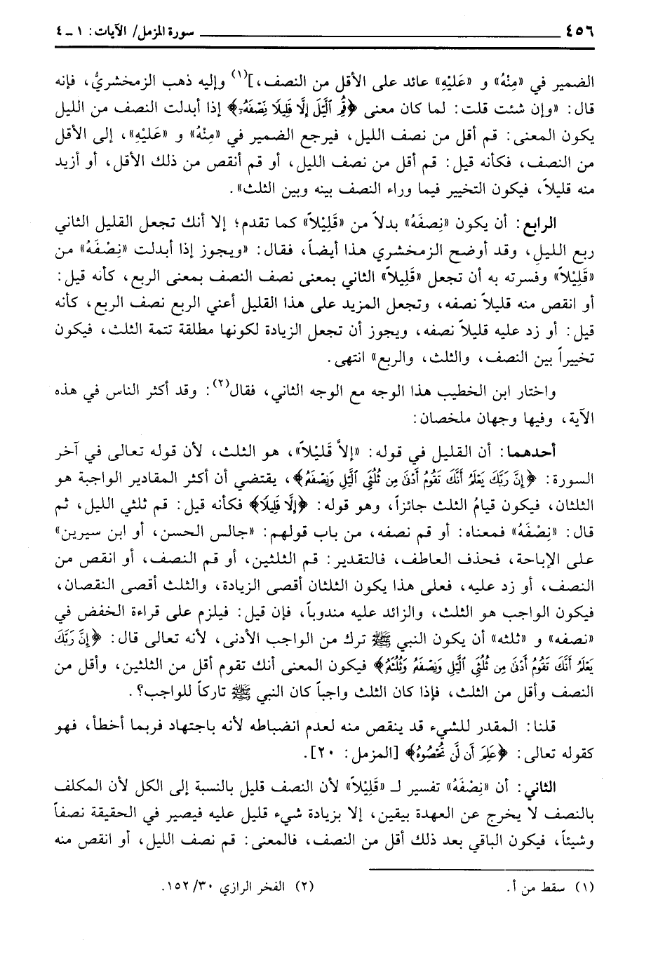 الثاني: أن «نِصْفَهُ» تفسير ل «قَلِيْلاً» لأن النصف قليل بالنسبة إلى الكل لأن المكلف بالنصف لا يخرج عن العهدة بيقين، إلا بزيادة شيء قليل عليه فيصير في الحقيقة نصفاً وشيئاً، فيكون الباقي بعد ذلك أقل من النصف، فالمعنى: قم نصف الليل، أو انقص منه