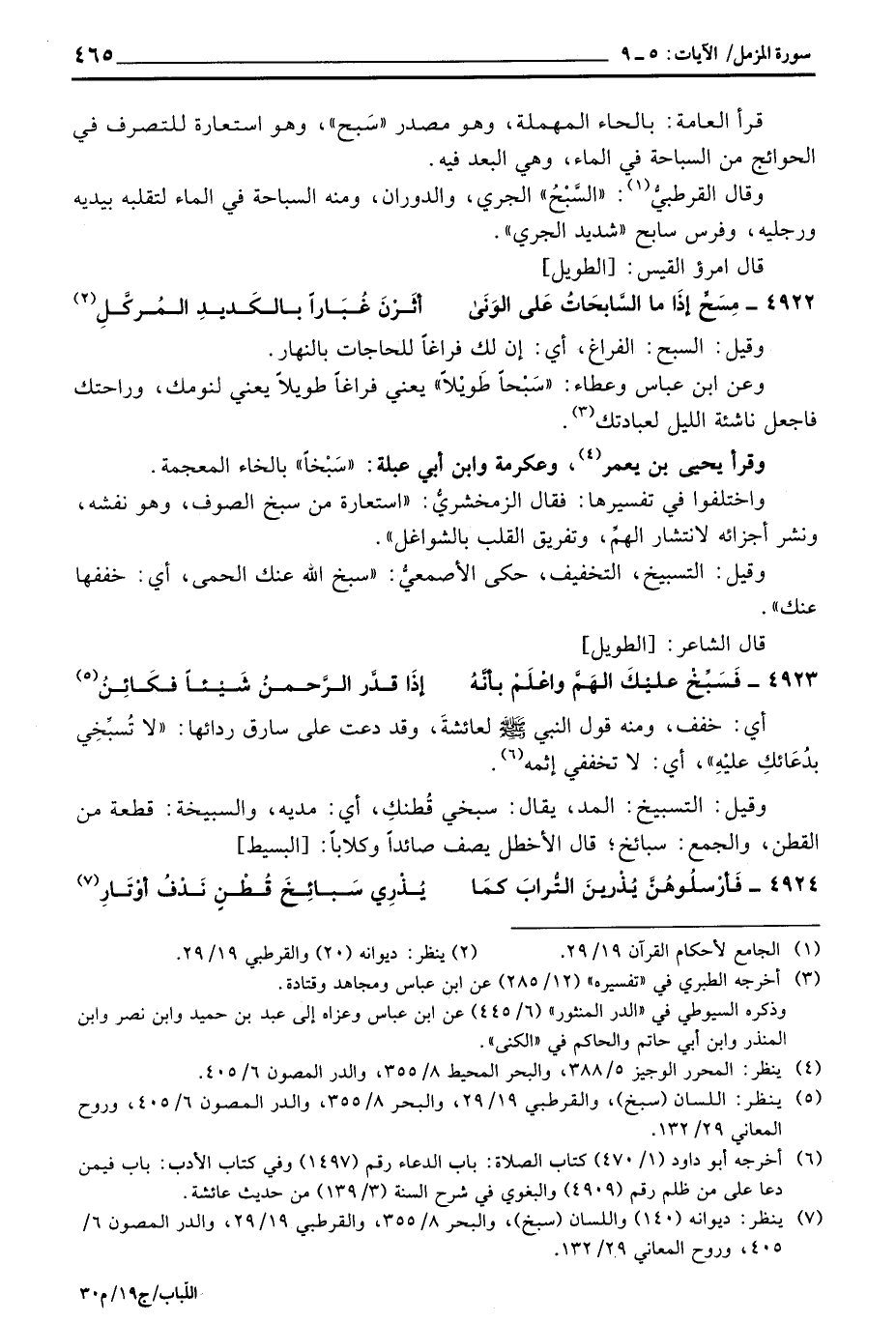 وقال القرطبيُّ: السَّبْحُ «الجري، والدوران، ومنه السباحة في الماء لتقلبه بيديه ورجليه، وفرس سابح» شديد الجري «. قال امرؤ القيس: [الطويل]