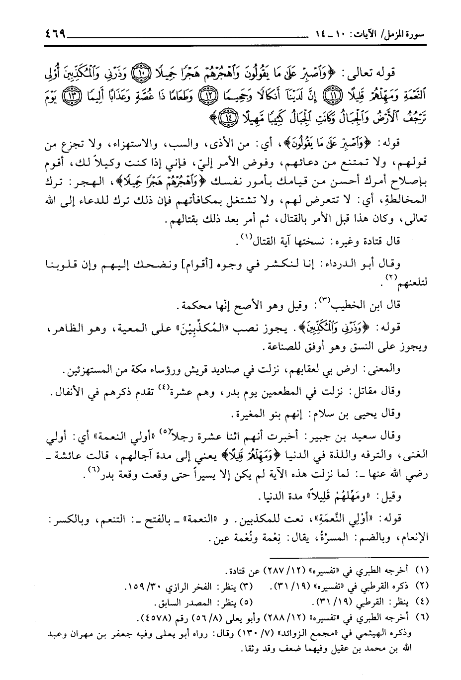 وقال سعيد بن جبير: أخبرت أنهم اثنا عشرة رجلاً، «أولي النعمة» أي: أولي الغنى، والترفه واللذة في الدنيا {وَمَهِّلْهُمْ قَلِيلاً} يعني إلى مدة آجالهم، قالت عائشة - رَضِيَ اللَّهُ عَنْها -: لما نزلت هذه الآية لم يكن إلا يسيراً حتى وقعت وقعة بدر.