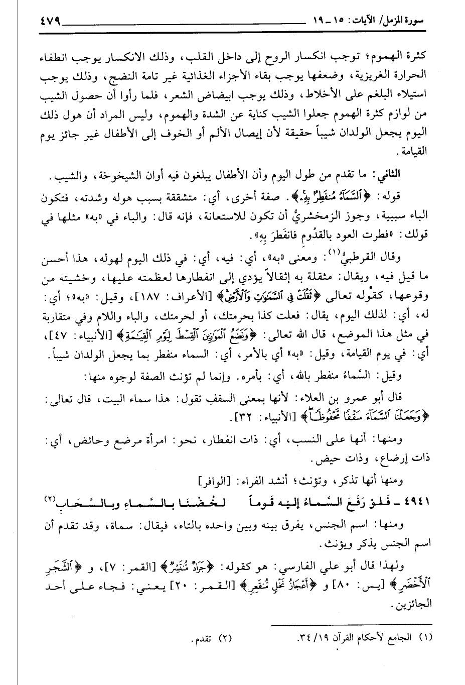 وقال القرطبيُّ: ومعنى «به» ، أي: فيه، أي: في ذلك اليوم لهوله، هذا أحسن ما قيل فيه، ويقال: مثقلة به إثقالاً يؤدي إلى انفطارها لعظمته عليها، وخشيته من وقوعها، كقوله تعالى: {ثَقُلَتْ فِي السماوات والأرض} [الأعراف: 187] ، وقيل: «به» ؛ أي: له، أي: لذلك اليوم، يقال: فعلت كذا بحرمتك، أو لحرمتك، والباء واللام وفي متقاربه في مثل هذا الموضع، قال الله تعالى: {وَنَضَعُ الموازين القسط لِيَوْمِ القيامة} [الأنبياء: 47] ، أي: في يوم القيامة، وقيل: «به» أي بالأمر، أي: السماء منفطر بما يجعل الولدان شيباً.