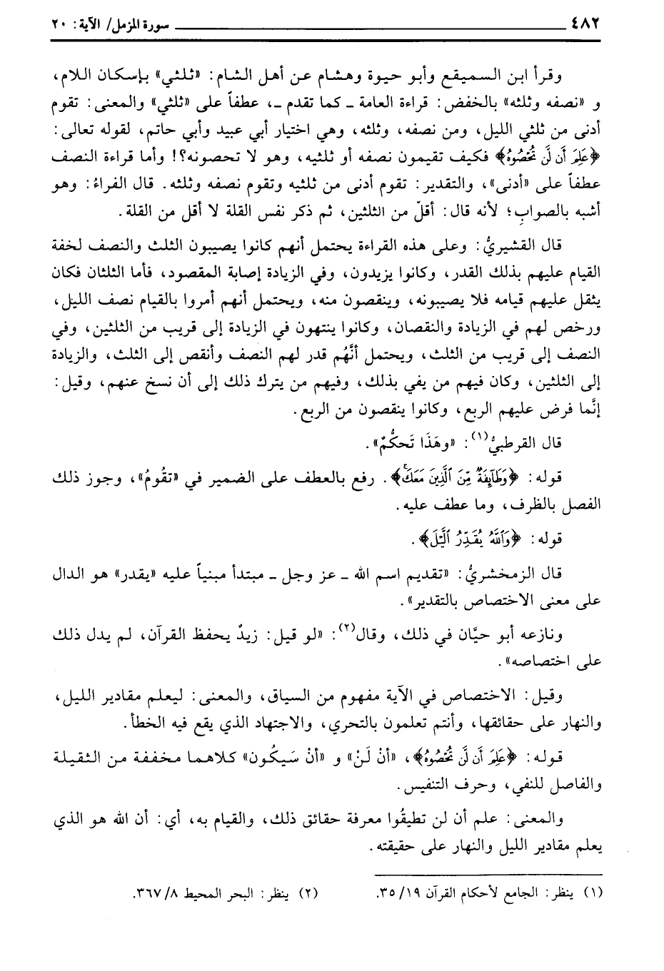 وقرأ ابن السميقع وأبو حيوة وهشام عن أهل الشام: «ثلثي» بإسكان اللام، و «نصفه وثلثه» بالخفض: قراءة العامة - كما تقدم -، عطفاً على «ثلثي» والمعنى: تقوم أدنى من ثلثي الليل، ومن نصفه، وثلثه، وهي اختيار أبي عبيد وأبي حاتم، لقوله تعالى: {عَلِمَ أَن لَّن تُحْصُوهُ} فكيف تقيمون نصفه أو ثلثيه، وهو لا تحصونه؟! وأما قراءة النصف عطفاً على «أدنى» ، والتقدير: تقوم أدنى من ثلثيه وتقوم نصفه وثلثه. قال الفراءُ: وهو أشبه بالصوابِ؛ لأنه قال: أقلّ من الثلثين، ثم ذكر نفس القلة لا أقل من القلة.