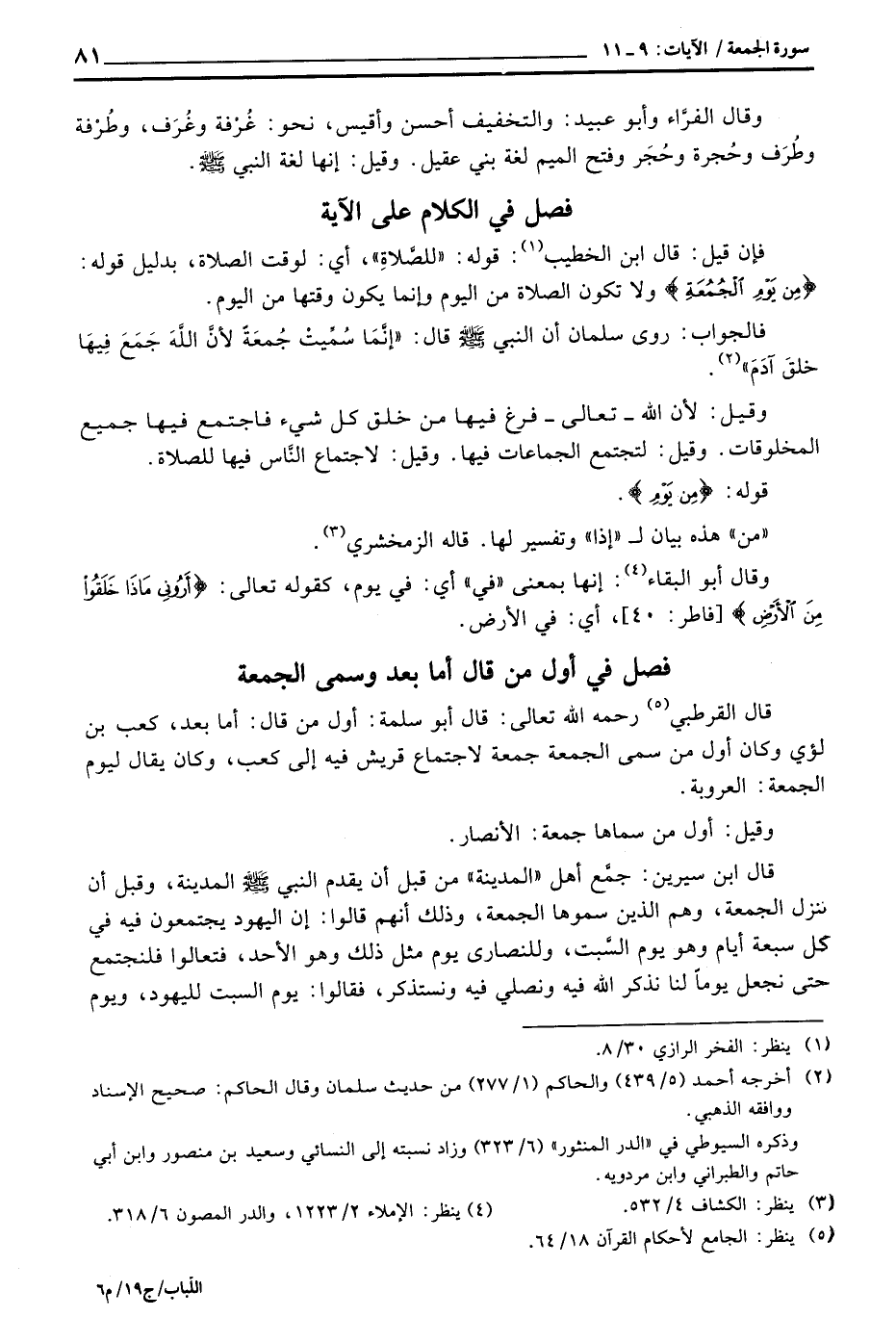 قال القرطبي رَحِمَهُ اللَّهُ تعالى: قال أبو سلمة: أول من قال: أما بعد، كعب بن لؤي وكان أول من سمى الجمعة جمعة لاجتماع قريش فيه إلى كعب، وكان يقال ليوم الجمعة: العروبة.