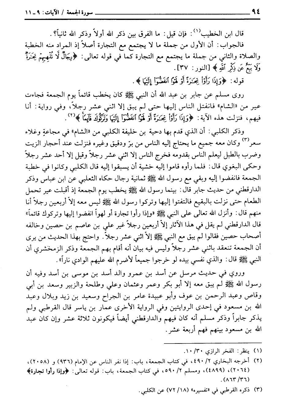 وذكر الكلبي: أن الذي قدم بها دحية بن خليفة الكلبي من «الشام» في مجاعةٍ وغلاء سعر وكان معه جميع ما يحتاج إليه الناس من برّ ودقيق وغيره فنزلت عند أحجار الزيت وضرب بالطبل ليعلم الناس بقدومه فخرج الناس إلا اثني عشر رجلاً وقيل إلا أحد عشر رجلاً وحكى البغوي قال: فلما رأوه قاموا إليه خشية أن يسبقوا إليه قال الكلبي وكانوا في خطبة الجمعة فانفضوا إليه وبقي مع رسول الله صَلَّى اللَّهُ عَلَيْهِ وَسَلَّم َ ثمانية رجال حكاه الثعلبي عن ابن عباس وذكر الدارقطني من حديث جابر قال: بينما رسول الله صَلَّى اللَّهُ عَلَيْهِ وَسَلَّم َ يخطب يوم الجمعة إذ أقبلت عير تحمل الطعام حتى نزلت بالبقيع فالتفتوا إليها وتركوا رسول الله صَلَّى اللَّهُ عَلَيْهِ وَسَلَّم َ ليس معه إلاّ أربعين رجلاً أنا منهم قال: وأنزل الله تعالى على النبي صَلَّى اللَّهُ عَلَيْهِ وَسَلَّم َ {وإذا رأوا تجارة أو لهواً انفضوا إليها وتركوك قائماً} قال الدارقطني لم يقل في هذا الآثار إلاّ أربعين رجلاً غير علي بن عاصم بن حصين وخالفه أصحاب حصين فقالوا لم يبق مع النبي صَلَّى اللَّهُ عَلَيْهِ وَسَلَّم َ إلاّ اثني عشر رجلاً. واحتج بهذا الحديث من يرى أن الجمعة تنعقد باثني عشر رجلاً وليس فيه بيان أنه أقام بهم الجمعة وذكر الزمخشري أن النبي صلى الله عيله وسلم قال: