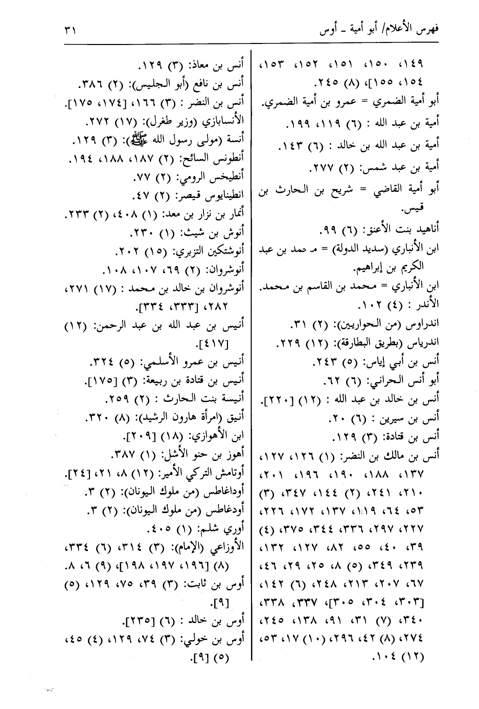 أنس بن مالك بن النضر: (1) 126، 127، 137، 188، 190، 196، 201، 210، 241، (2) 144، 347، (3) 53، 64، 119، 137، 172، 226، 227، 297، 336، 344، 375، (4) 39، 40، 55، 82، 127، 132، 239، 349، (5) 8، 25، 29، 46، 67، 207، 213، 248، (6) 142، [303، 304، 305] ، 337، 338، 340، (7) 31، 91، 138، 245، 274، (8) 42، 296، (10) 17، 53، (12) 104. أنس بن معاذ: (3) 129.