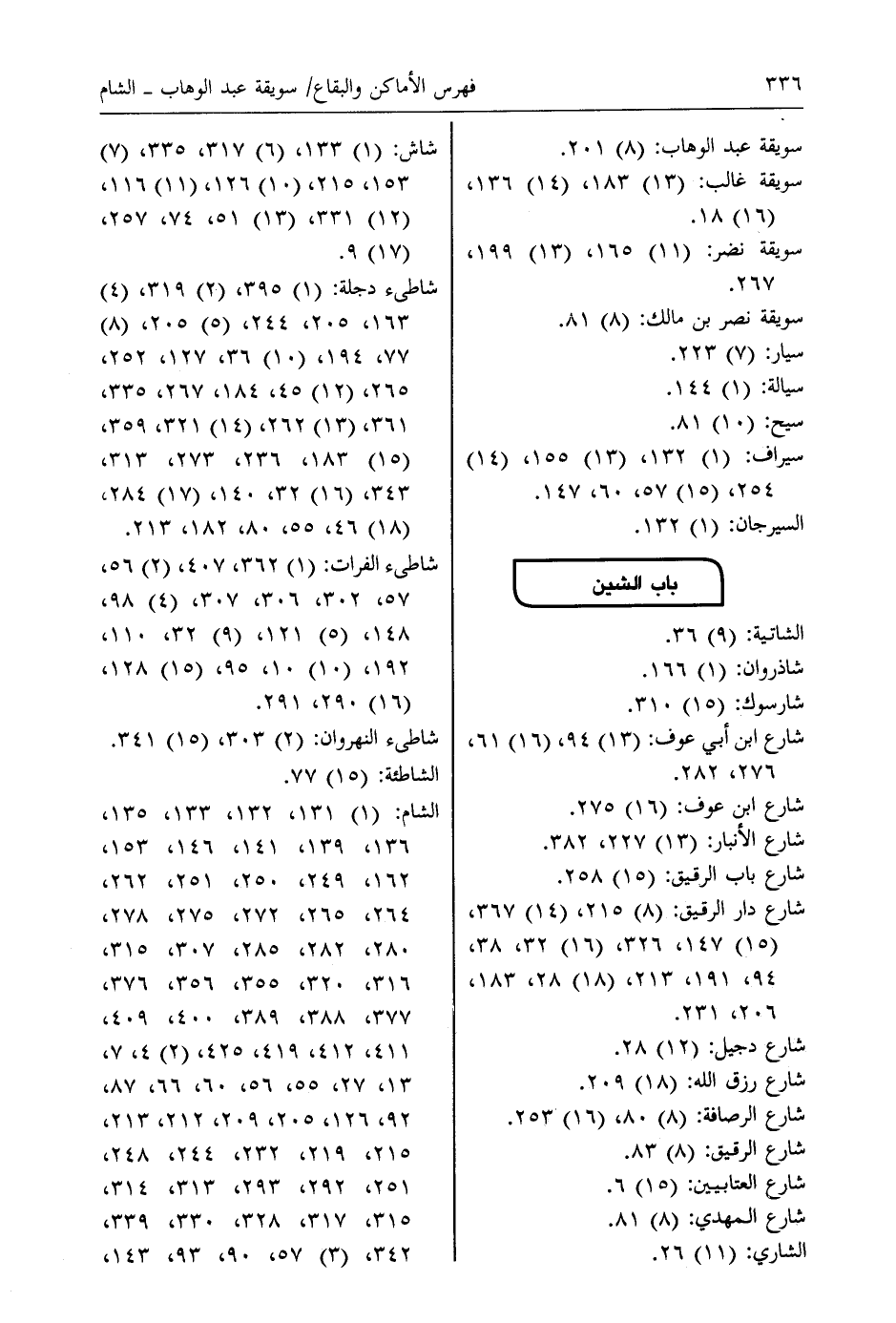 الشام: (1) 131، 132، 133، 135، 136، 139، 141، 146، 153، 162، 249، 250، 251، 262، 264، 265، 272، 275، 278، 280، 282، 285، 307، 315، 316، 320، 355، 356، 376، 377، 388، 389، 400، 409، 411، 412، 419، 425، (2) 4، 7، 13، 27، 55، 56، 60، 66، 87، 92، 126، 205، 209، 212، 213، 215، 219، 232، 244، 248، 251، 292، 293، 313، 314، 315، 317، 328، 330، 339، 342، (3) 57، 90، 93، 143 ص،