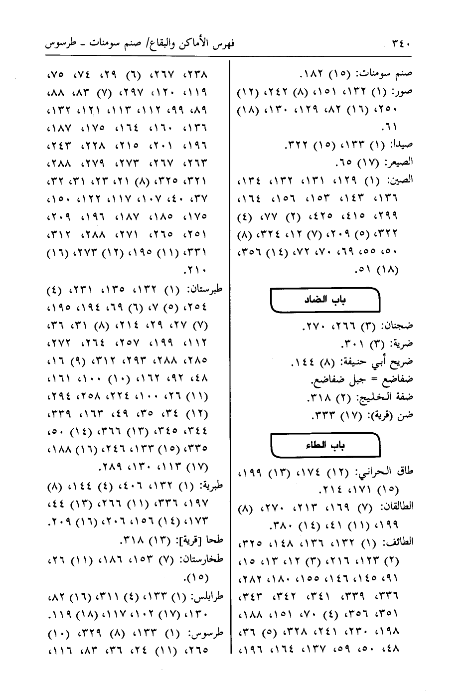 الطائف: (1) 132، 136، 148، 325، (2) 123، 216، (3) 12، 13، 15، 91، 145، 146، 155، 180، 282، 336، 339، 341، 342، 343، 351، 356، (4) 70، 151، 188، 198، 230، 241، 328، (5) 36، 48، 50، 59، 137، 164، 196، 238، 267، (6) 29، 74، 75، 119، 120، 297، (7) 83، 88، 89، 99، 112، 113، 121، 132، 136، 160، 164، 175، 187، 196، 201، 215، 228، 243، 263، 267، 273، 279، 288، 321، 325، (8) 21، 23، 31، 32، 37، 40، 107، 117، 122، 150، 175، 185، 187، 196، 209، 251، 265، 271، 288، 312، 331، (11) 195، (12) 273، (16) 210.