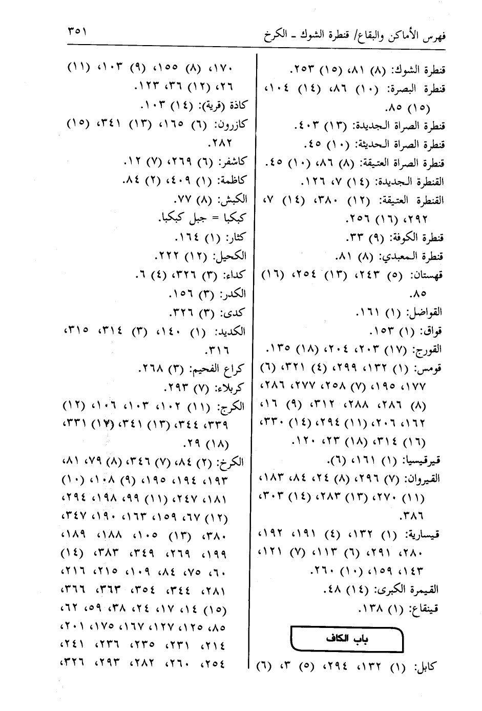 باب الكاف كابل: (1) 132، 294، (5) 3، (6) 170، (8) 155، (9) 103، (11) 26، (12) 36، 123.