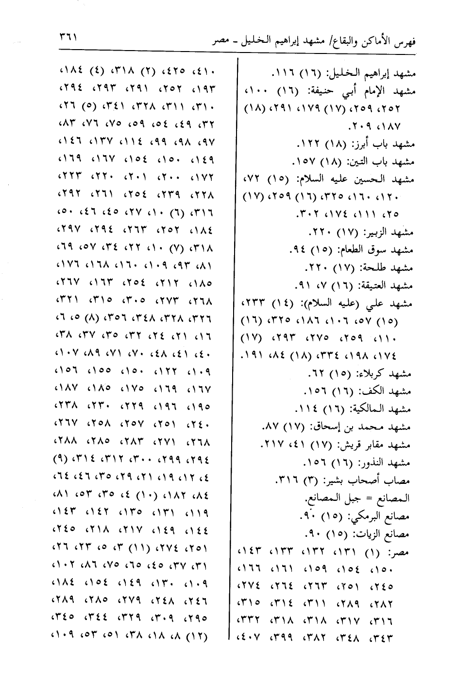 مشهد علي (عليه السلام) : (14) 233، (15) 57، 106، 186، 325، (16) 110، 259، 275، 293، (17) 174، 198، 334، (18) 84، 191.