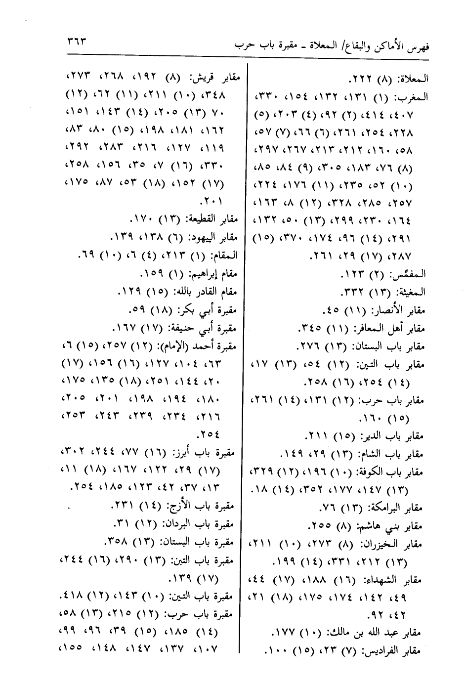 مقابر قريش: (8) 192، 268، 273، 348، (10) 211، (11) 62، (12) 70، (13) 205، (14) 143، 151، 162، 181، 198، (15) 80، 83، 119، 127، 216، 283، 292، 330، (16) 7، 35، 156، 258، (17) 152، (18) 53، 87، 175، 201.
