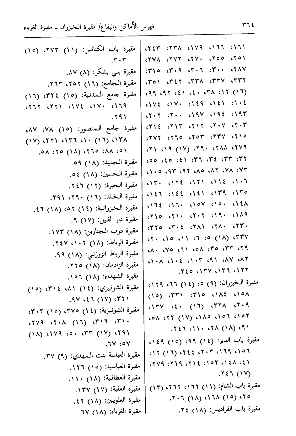مقبرة جامع المنصور: (15) 78، 87، 138، (16) 10، 136، 221، (17) 51، 88، 265، (18) 25، 58.