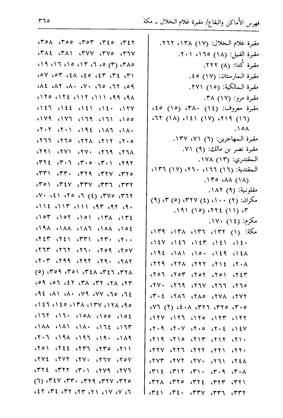 مكة: (1) 132، 136، 138، 139، 140، 141، 143، 146، 147، 148، 149، 150، 181، 194، 208، 214، 222، 228، 229، 243، 251، 252، 253، 256، 265، 266، 267، 269، 270، 272، 278، 285، 286، 304، 305، 325، 326، 408، (2) 76، 122، 123، 125، 126، 127، 147، 204، 205، 207، 209، 210، 212، 213، 215، 219، 220، 221، 222، 226، 227، 248، 261، 270، 272، 273، 308، 309، 310، 312، 314، 321، 323، 324، 325، 328، 332، 336، 337، 340، 341 ص، 342، 345، 353، 355، 358، 367، 375، 377، 381، 384، 385، (3) 5، 6، 13، 15، 16، 19، 31، 34، 43، 45، 48، 53، 57، 59، 62، 65، 70، 80، 82، 84، 98، 99، 111، 112، 124، 125، 127، 140، 141، 144، 146، 155، 161، 169، 176، 179، 180، 186، 194، 201، 202، 205، 212، 228، 265، 266، 268، 269، 270، 271، 291، 292، 301، 305، 306، 324، 325، 327، 329، 330، 331، 332، 336، 337، 347، 351، 362، 375، (4) 6، 25، 41، 70، 90، 92، 93، 111، 113، 114، 134، 138، 151، 152، 153، 154، 158، 186، 188، 198، 200، 230، 331، 241، 243، 257، 259، 260، 262، 263، 282، 290، 292، 299، 203، 328، 346، 348، 351، 359، (5) 23، 28، 32، 38، 42، 56، 59، 64، 65، 77، 79، 80، 81، 94، 95، 128، 137، 138، 145، 146، 154، 155، 158، 160، 162، 163، 164، 180، 181، 188، 189، 190، 196، 198، 206، 211، 235، 236، 244، 251، 257، 267، 270، 272، 274، 276، 279، 301، 322، 324، 325، 327، 329، 330، 347، (6) 6، 7، 17، 21، 23، 32، 34، 42 ص،