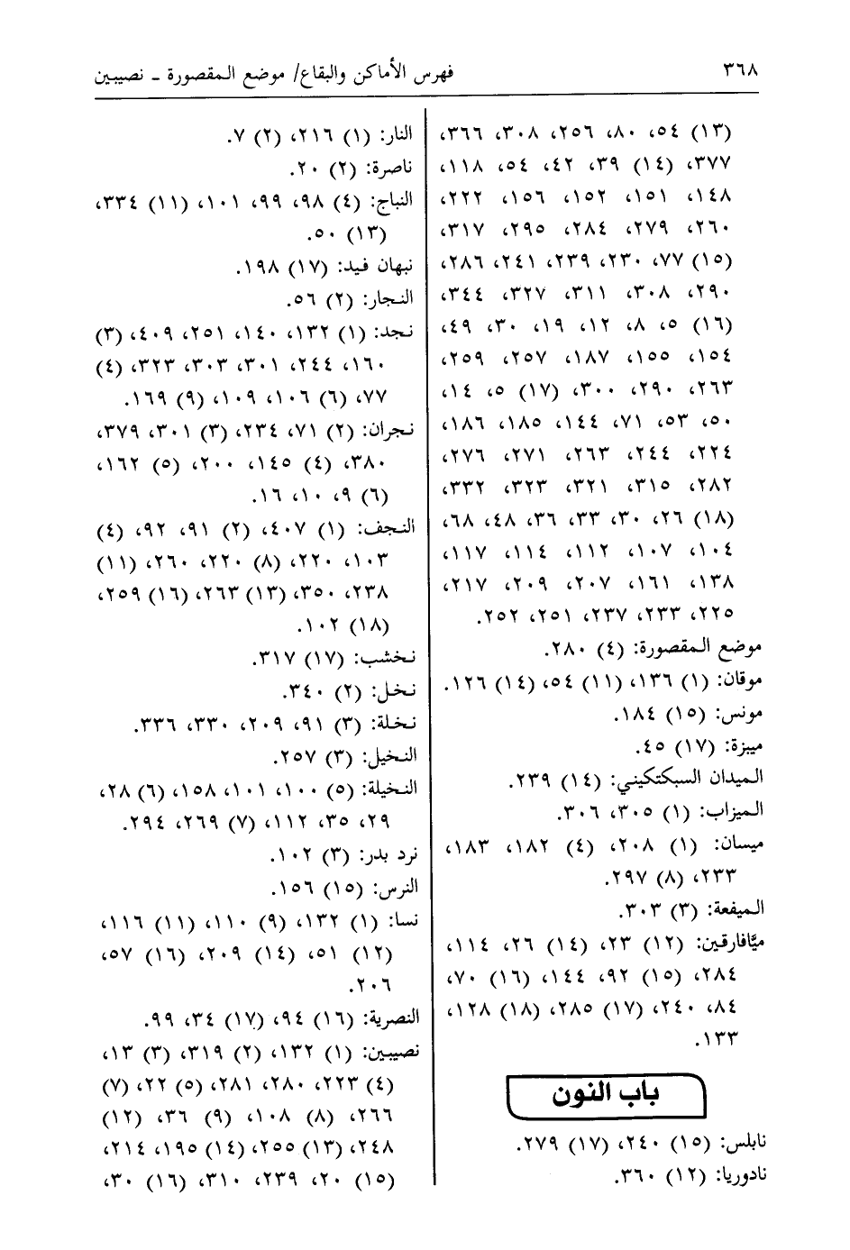 نصيبين: (1) 132، (2) 319، (3) 13، (4) 223، 280، 281، (5) 22، (7) 266، (8) 108، (9) 36، (12) 248، (13) 255، (14) 195، 214، (15) 20، 239، 310، (16) 30،