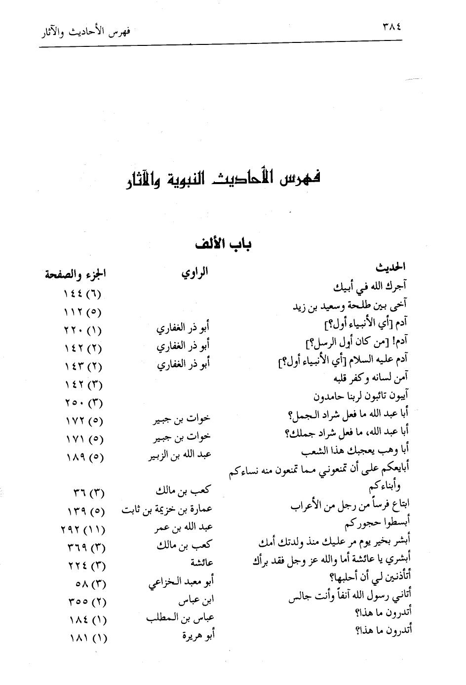 باب الألف الحديث/ الراويّ/ الجزء والصفحة آجرك الله في أبيك// (6) 144 آخى بين طلحة وسعيد بن زيد// (5) 112 آدم [أي الأنبياء أول؟] / أبو ذر الغفاريّ/ (1) 220 آدم! [من كان أول الرسل؟] / أبو ذر الغفاريّ/ (2) 142 آدم عليه السلام [أي الأنبياء أول؟] / أبو ذر الغفاريّ/ (2) 143 آمن لسانه وكفر قلبه// (3) 142 آئبون تائبون لربنا حامدون// (3) 250 أَبَا عَبْدِ اللَّهِ مَا فَعَلَ شِرَادُ الْجَمَلِ؟ / خوات بن جبير/ (5) 172 أَبَا عَبْدِ اللَّهِ، مَا فَعَلَ شِرَادُ جَمَلِكَ؟ / خوات بن جبير/ (5) 171 أبا وهب يعجبك هذا الشعب/ عبد الله بن الزبير/ (5) 189 أبايعكم على أن تمنعوني مما تمنعون منه نساءكم// وأبناءكم/ كعب بن مالك/ (3) 36 ابتاع فرسا من رجل من الأعراب/ عمارة بن خزيمة بن ثابت/ (5) 139 أبسطوا حجوركم/ عبد الله بن عمر/ (11) 292 أَبْشِرْ بِخَيْرِ يَوْمٍ مَرَّ عَلَيْكَ مُنْذُ وَلَدَتْكَ أمك/ كعب بن مالك/ (3) 369 أَبْشِرِي يَا عَائِشَةُ أَمَا وَاللَّهِ عَزَّ وَجَلَّ فقد برأك/ عائشة/ (3) 224 أتأذنين لي أن أحلبها؟ / أبو معبد الخزاعي/ (3) 58 أتاني رسول الله آنفا وأنت جالس/ ابن عباس/ (2) 355 أتدرون ما هذا؟ / عباس بن المطلب/ (1) 184 أتدرون ما هذا؟ / أبو هريرة/ (1) 181