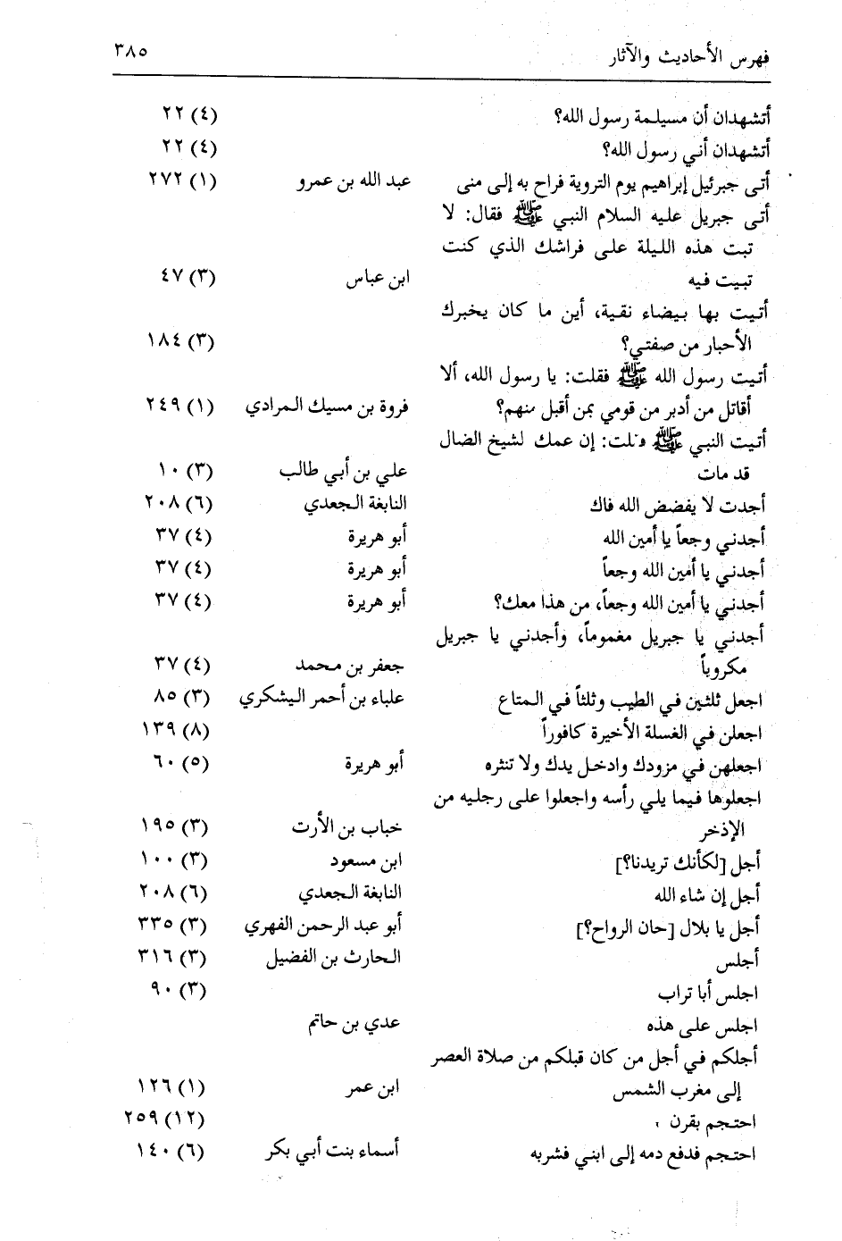 أتشهدان أن مسيلمة رسول الله؟ // (4) 22 أتشهدان أني رسول الله؟ // (4) 22 أَتَى جِبْرَئِيلُ إِبْرَاهِيمَ يَوْمَ التَّرْوِيَةِ فَرَاحَ بِهِ إلى منى/ عبد الله بن عمرو/ (1) 272 أتى جِبْرِيلُ عَلَيْهِ السَّلامُ النَّبِيَّ صَلَّى اللَّهُ عَلَيْهِ وسلم فقال: لا// تبت هذه الليلة على فراشك الّذي كنت// تبيت فيه/ ابن عباس/ (3) 47 أتيت بها بيضاء نقية، أين ما كان يخبرك// الأحبار من صفتي؟ // (3) 184 أَتَيْتُ رَسُولَ اللَّهِ صَلَّى اللَّهُ عَلَيْهِ وَسَلَّمَ فَقُلْتُ: يَا رَسُولَ اللَّهِ، أَلا أُقَاتِلُ مَنْ أدبر من قومي بمن أقبل منهم؟ / فروة بن مسيك المرادي/ (1) 249 أَتَيْتُ النَّبِيَّ صَلَّى اللَّهُ عَلَيْهِ وَسَلَّمَ فَقُلْتُ: إن عمك الشيخ الضال قد مات/ علي بن أبي طالب/ (3) 10 أجدت لا يفضض الله فاك/ النابغة الجعديّ/ (6) 208 أجدني وجعا يا أمين الله/ أبو هريرة/ (4) 37 أجدني يا أمين الله وجعا/ أبو هريرة/ (4) 37 أَجِدُنِي يَا أَمِينَ اللَّهِ وَجِعًا، مَنْ هَذَا معك؟ / أبو هريرة/ (4) 37 أَجِدُنِي يَا جِبْرِيلُ مَغْمُومًا، وَأَجِدُنِي يَا جِبْرِيلُ مكروبا/ جعفر بن محمد/ (4) 37 اجعل ثلاثين في الطيب وثلثا في المتاع/ علباء بن أحمر اليشكري/ (3) 85 اجعلن في الغسلة الأخيرة كافورا// (8) 139 اجْعَلْهُنَّ فِي مِزْوَدِكَ وَأَدْخِلْ يَدَكَ وَلا تَنْثُرْهُ/ أبو هريرة/ (5) 60 اجْعَلُوهَا فِيمَا يَلِي رَأْسَهُ وَاجْعَلُوا عَلَى رِجْلَيْهِ من الإذخر/ خباب بن الأرت/ (3) 195 أجل [لكأنك تريدنا؟] / ابن مسعود/ (3) 100 أجل إن شاء الله/ النابغة الجعديّ/ (6) 208 أجل يا بلال [حان الرواح؟] / أبو عبد الرحمن الفهري/ (3) 335 أجلس/ الحارث بن الفضيل/ (3) 316 اجلس أبا تراب// (3) 90 اجلس على هذه/ عدي بن حاتم/ أَجَلُكُمْ فِي أَجَلِ مَنْ كَانَ قَبْلَكُمْ مِنْ صلاة العصر إلى مغرب الشمس/ ابن عمر/ (1) 126 احتجم بقرن// (12) 259 احتجم فدفع دمه إلى ابني فشربه/ أسماء بنت أبي بكر/ (6) 140
