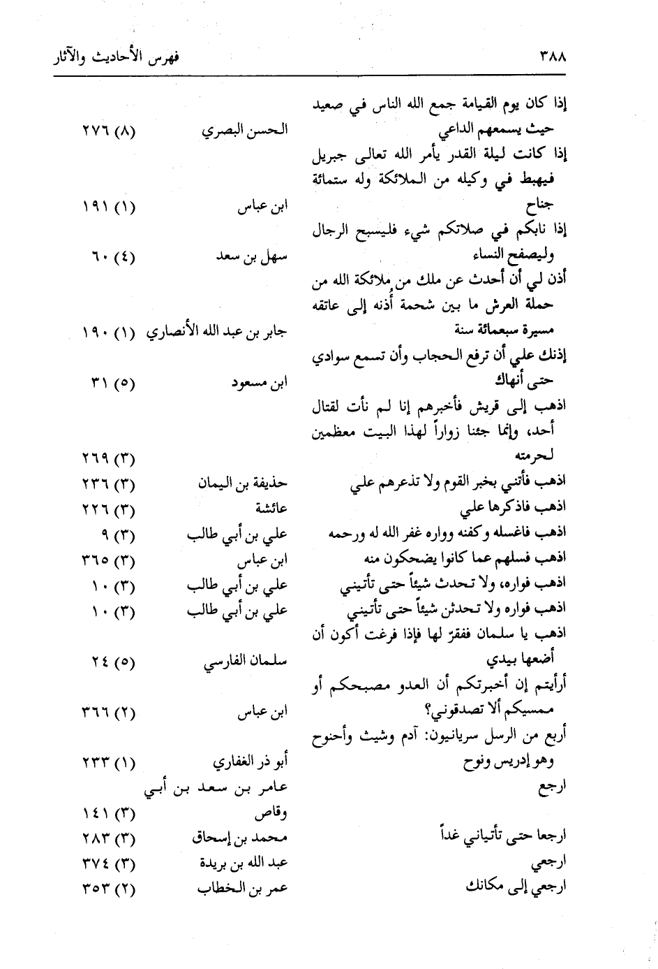 إِذَا كَانَ يَوْمُ الْقِيَامَةِ جَمَعَ اللَّهُ النَّاسَ في صعيد حيث يسمعهم الداعي/ الحسن البصري/ (8) 276 إِذَا كَانَتْ لَيْلَةُ الْقَدْرِ يَأْمُرُ اللَّهُ تَعَالَى جِبْرِيلَ فَيَهْبِطُ فِي وَكِيلِهِ مِنَ الْمَلائِكَةِ وَلَهُ ستمائة جناح/ ابن عباس/ (1) 191 إِذَا نَابَكُمْ فِي صَلاتِكُمْ شَيْءٌ فَلْيُسَبِّحِ الرِّجَالُ وليصفح النساء/ سهل بن سعد/ (4) 60 أُذِنَ لِي أَنْ أُحَدِّثَ عَنْ مَلَكٍ مِنْ مَلائِكَةِ اللَّهِ مِنْ حَمَلَةِ الْعَرْشِ مَا بَيْنَ شحمة أذنه إلى عاتقه مسيرة سبعمائة سنة/ جابر بن عبد الله الأنصاري/ (1) 190 إذنك علي أن ترفع الحجاب وأن تسمع سوادي حتى أنهاك/ ابن مسعود/ (5) 31 اذهب إلى قريش فأخبرهم أنا لم نأت لقتال أحد، وإنما جئنا زوارا لهذا البيت معظمين لحرمته// (3) 269 اذهب فأتني بخبر القوم ولا تذعرهم علي/ حذيفة بن اليمان/ (3) 236 اذهب فاذكرها علي/ عائشة/ (3) 226 اذْهَبْ فَاغْسِلْهُ وَكَفِّنْهُ وَوَارِهِ غَفَرَ اللَّهُ لَهُ ورحمه/ علي بن أبي طالب/ (3) 9 اذهب فسلهم عما كانوا يضحكون منه/ ابن عباس/ (3) 365 اذْهَبْ فَوَارِهِ، وَلا تُحْدِثْ شَيْئًا حَتَّى تَأْتِيَنِي/ علي بن أبي طالب/ (3) 10 اذْهَبْ فَوَارِهِ وَلا تُحْدِثَنَّ شَيْئًا حَتَّى تَأْتِيَنِي/ علي بن أبي طالب/ (3) 10 اذْهَبْ يَا سَلْمَانُ فَفَقِّرْ لَهَا فَإِذَا فَرَغْتَ أكون أن أضعها بيدي/ سلمان الفارسيّ/ (5) 24 أَرَأَيْتُمْ إِنْ أَخْبَرْتُكُمْ أَنَّ الْعَدُوَّ مُصَبِّحُكُمْ أَوْ ممسيكم ألا تصدقوني؟ / ابن عباس/ (2) 366 أَرْبَعٌ مِنَ الرُّسُلِ سِرْيَانِيِّونَ: آَدَمُ وَشِيثٌ وأخنوخ وهو إدريس ونوح/ أبو ذر الغفاريّ/ (1) 233 ارجع/ عامر بن سعد بن أبي وقاص/ (3) 141 ارجعا حتى تأتياني غدا/ محمد بن إسحاق/ (3) 283 ارجعي/ عبد الله بن بريدة/ (3) 374 ارجعي إلى مكانك/ عمر بن الخطاب/ (2) 353